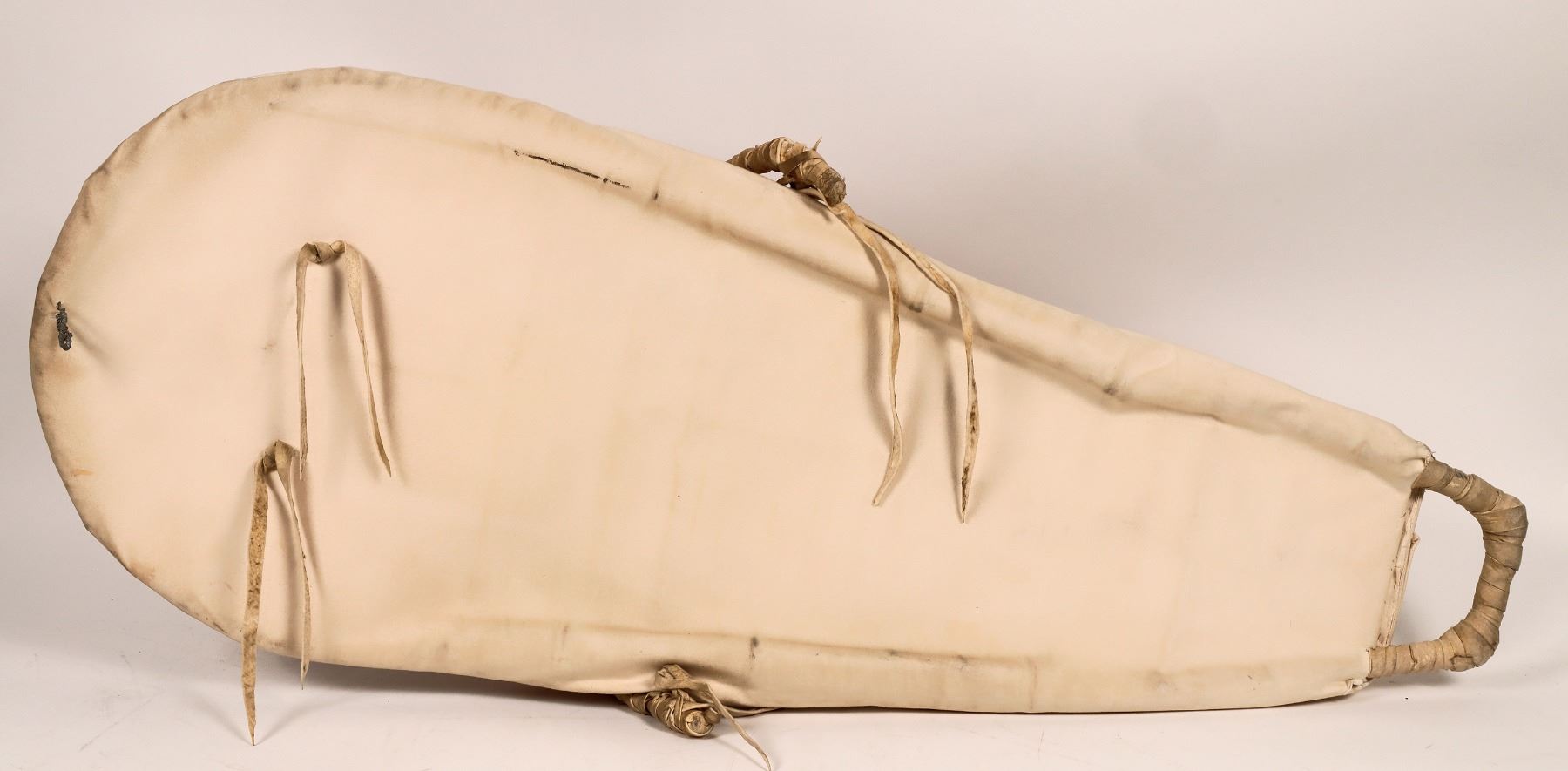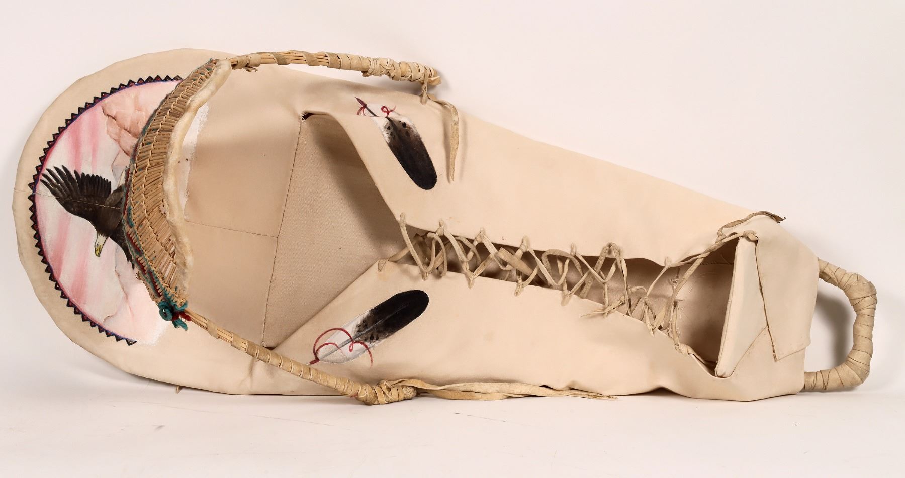 Shoshone baby basket with heavy back material, overall basketry is crude. Shade pattern consistent with a baby girl. Made with commercial material and vertical rattan. Weaving material probably rattan. Yarn used on shade. Buckskin on underside. Painted bald eagle and 2 feathers symbolizing good luck. This style of basket was made for sale rather than use. 39x16x14".