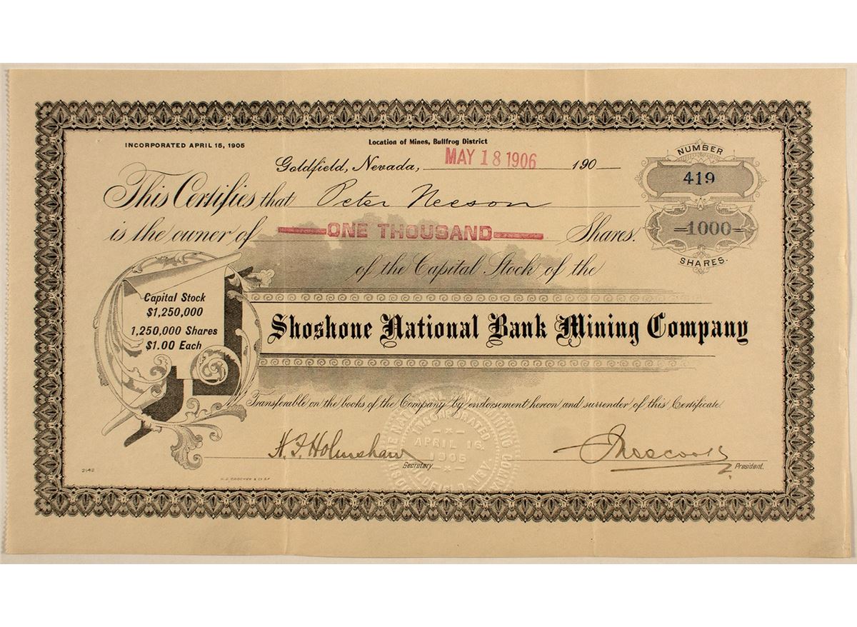 Incorporated April 15, 1905 (does not specify where). No. 419 issued May 18, 1906 to Peter Neeson for 1000 shares. Signed by the President, Jno Cook and H.F. Holmshaw, Secretary. Printed by H.S. Crocker & Co., S.F.. U/C. Black ink on crème paper. No vignette. Location of mines, Bullfrog District. This company appears to be the same property as the Bullfrog National Bank, but we are unsure how they are related. They could be two different issues floated for the same property, which would be unethical promoting. The other possibility is that the company was a rip-off of the real National Bank property. John Cook, signing as president, would go on to create his own bank with branches in Goldfield, Beatty, and Rhyolite.