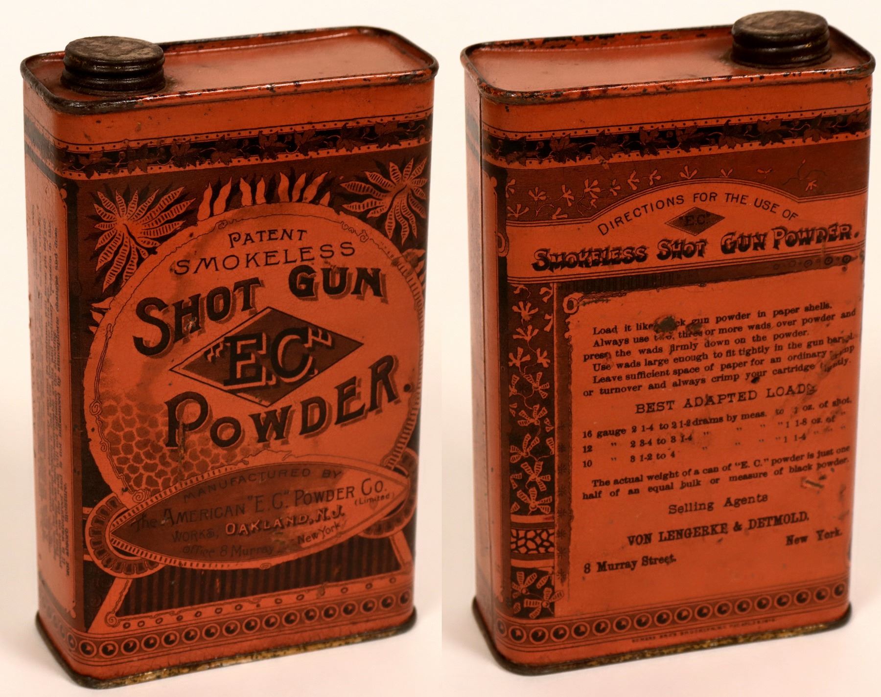 Patent Smokeless Shot Gun "E. C." Powder. Manufactured by the American "E. C." Powder Co. (Limited) Works, Oakland, N. J. Office 8 Muirray, New York. Directions for use on reverse. 5.5" x 3.5" x 1.5". Screw Top Lid. RARE!