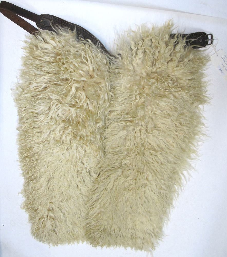 Unmarked chaps, closed leg shotgun style. Canvass lined. Generally very fine. Date: Location: HWAC # 55937