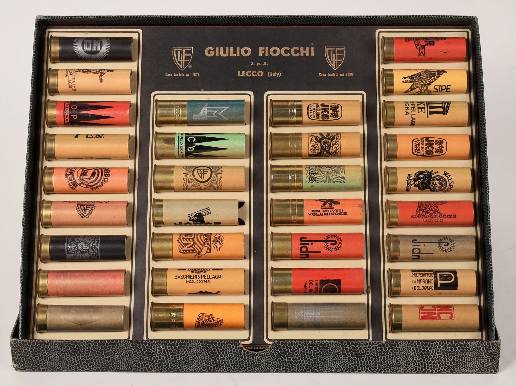 A sample box carried by salesmen to sell Giulio Fiocchi shotgun shells. There are 32 colorful empty 12 gauge casings, showing off the company's product. Box is a little worn but in nice condition. Please see photos for more detail. Italy 20th Century