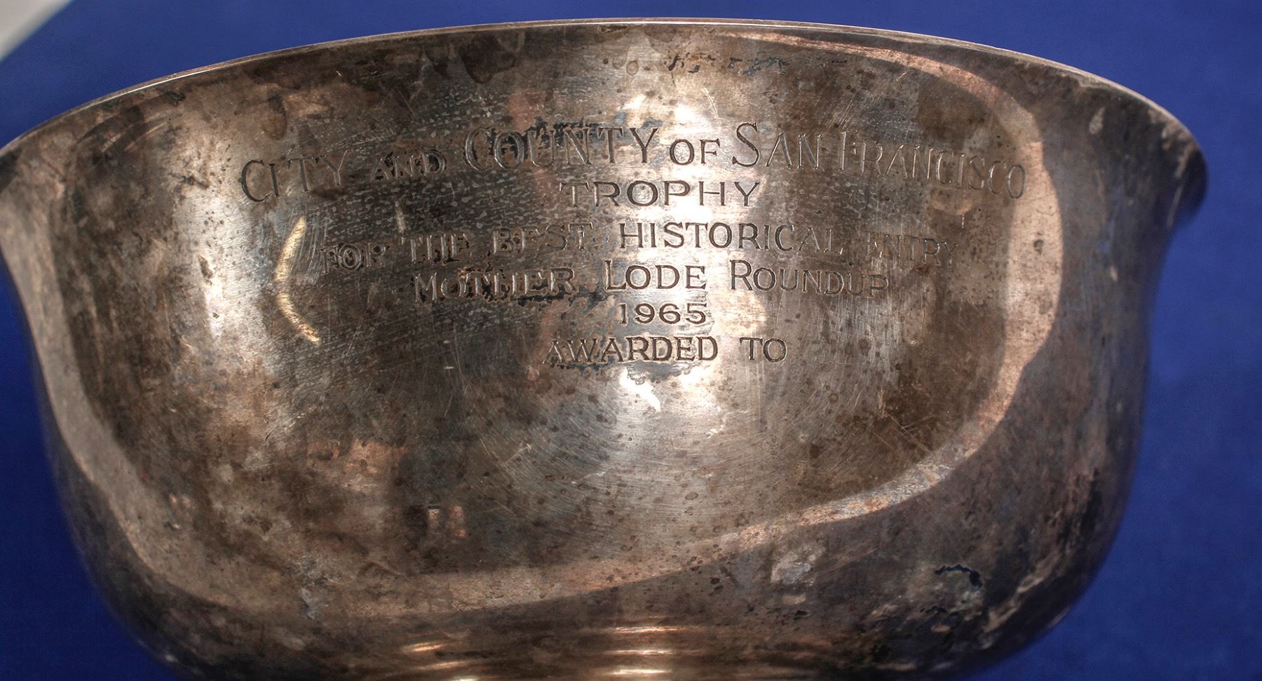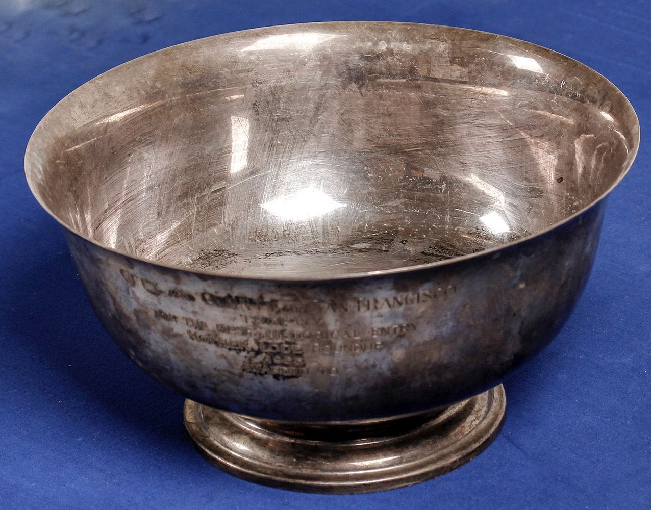 Presented by "City and County of San Francisco / Trophy / For the Best Historical Entry / Mother Lode Roundup / 1965 / Awarded to [blank]." Nine inches in diameter and 4.75 inches tall. Hallmarked, "Shreve & Co / San Francisco / Sterling / Paul Revere / Reproduction / 10116." 763 grams or 24.5 troy oz. Nice western and Eastern historic item. Good condition. Needs polishing. Date: Location: San Francisco, California HWAC# 58204