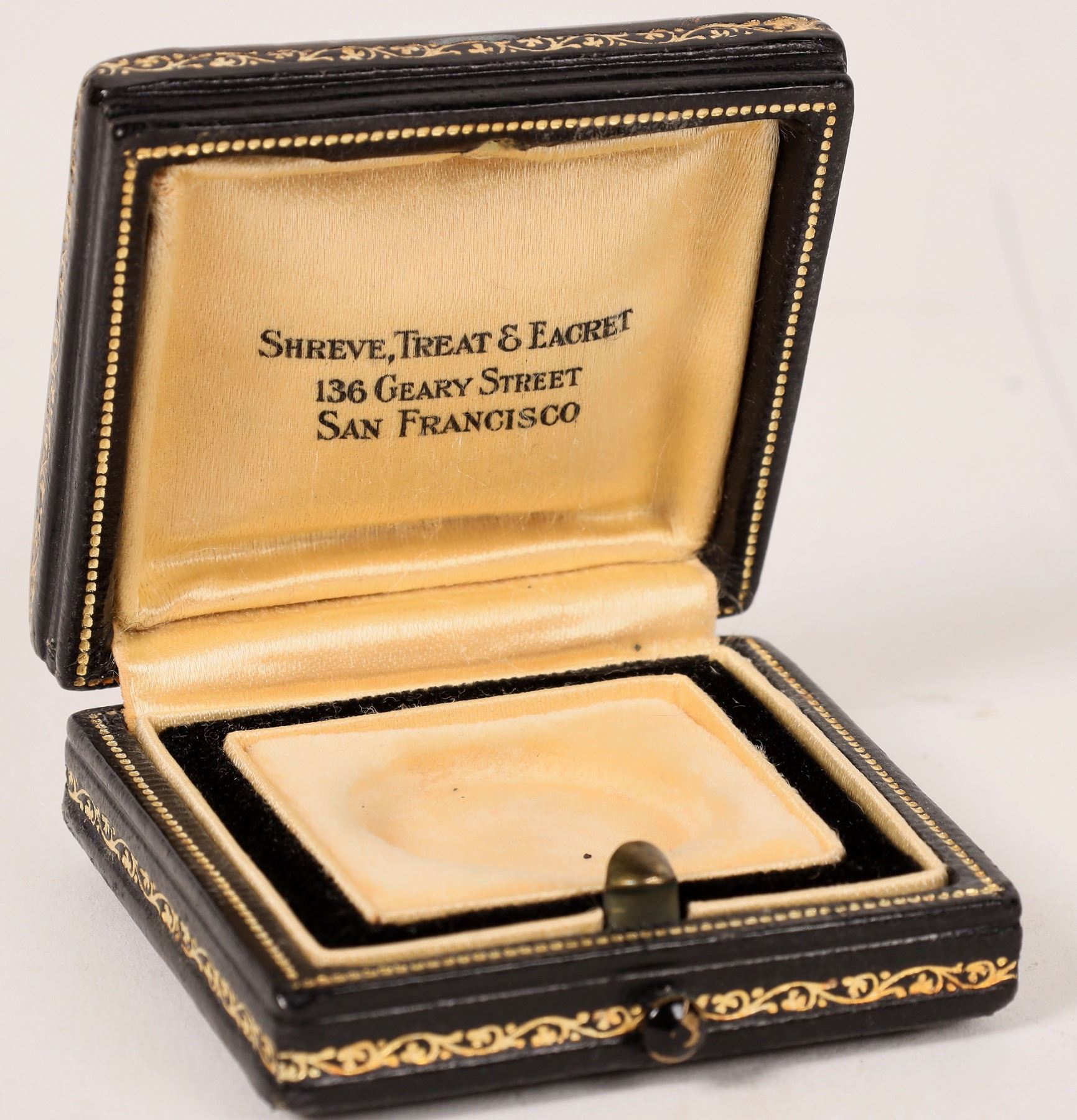 Original ring box from Shreve, Treat & Eacret, 136 Geary Street, San Francisco. 48 x 44 x 21 mm; with a place for a 21 mm coin or ring. Latching top. Jewelers George C. Shreve and his nephew Samuel S. Shreve In 1852 opened the Shreve Jewelry Company at 110 Montgomery Street on the corner of Clay Street. The San Francisco Call reported on July 16, 1912: "The firm of Treat & Eacret, jewelers and silversmiths, will henceforward be known as Shreve, Treat & Eacret as a result of the purchase of a large portion of the stock of the company by George Shreve, who was formerly a member of the jewelry and silversmith establishment of Shreve & Co. at Post ' street and Grant avenue. For the last year Georgre Shreve has been out of the Shreve company, recently deciding to become allied with the Treat & Eacret establishment, whose store is at 136 Geary street." California San Francisco