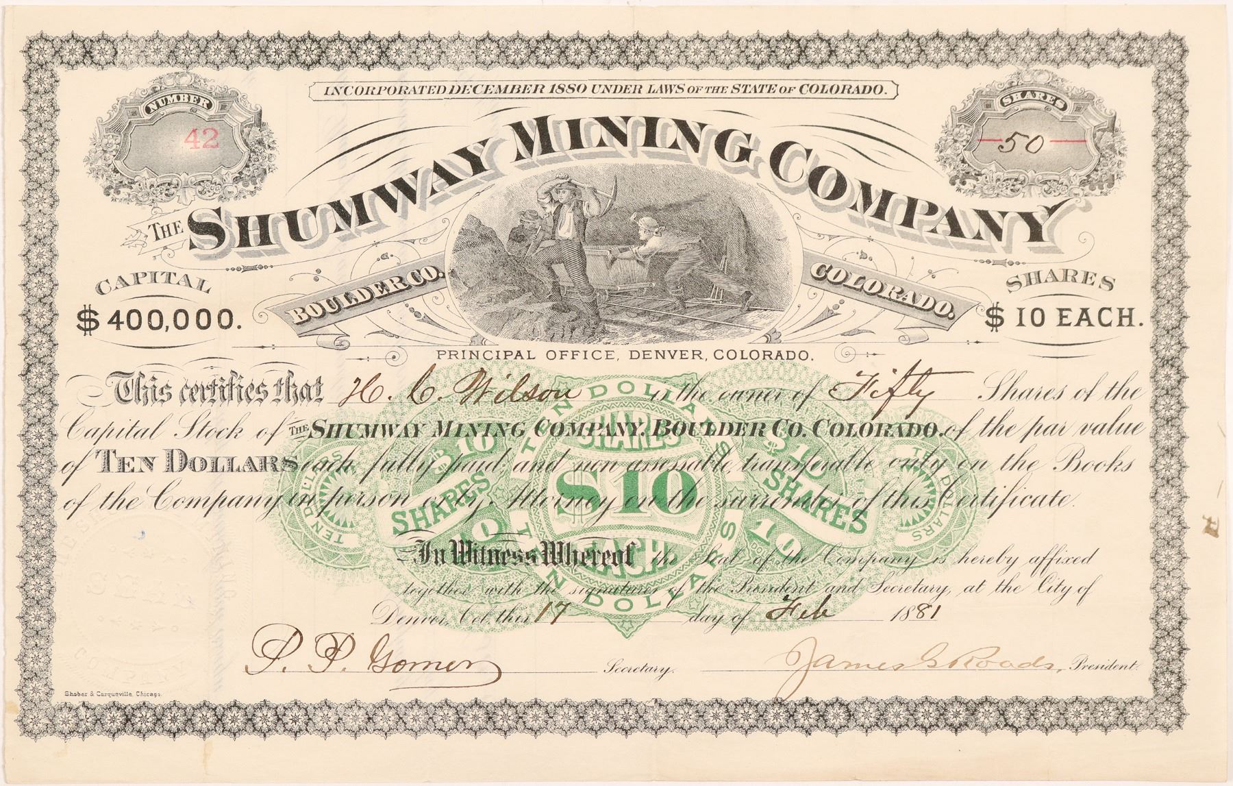 Boulder Co., Colorado printed on the certificate. Inc. in Colorado. No. 42, issued for 50 shares to H.C. Wilson on Feb. 17th, 1881 in Denver. Signed by president James Roads and secretary P.P. Gormer. Not cancelled. Black border and print, green facsimile underprint, mining vignette. Heavy folds, some soiling. 6.5 x 10.25" Not listed in C&L or Fossett. Not found on CHNC or newspapers.com