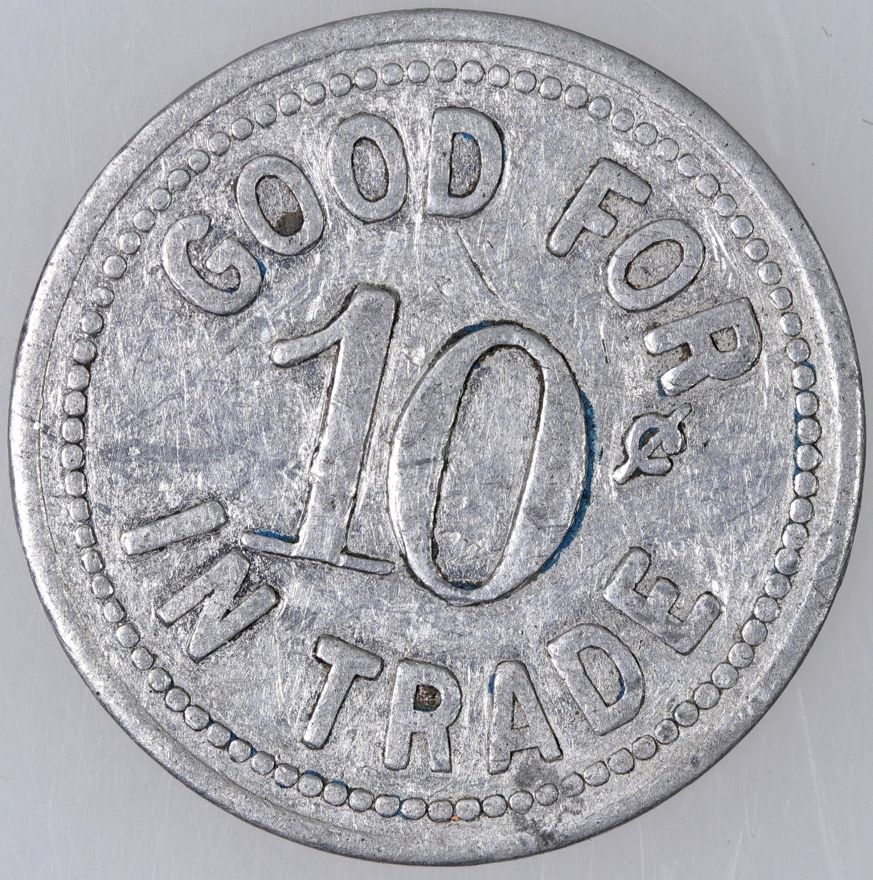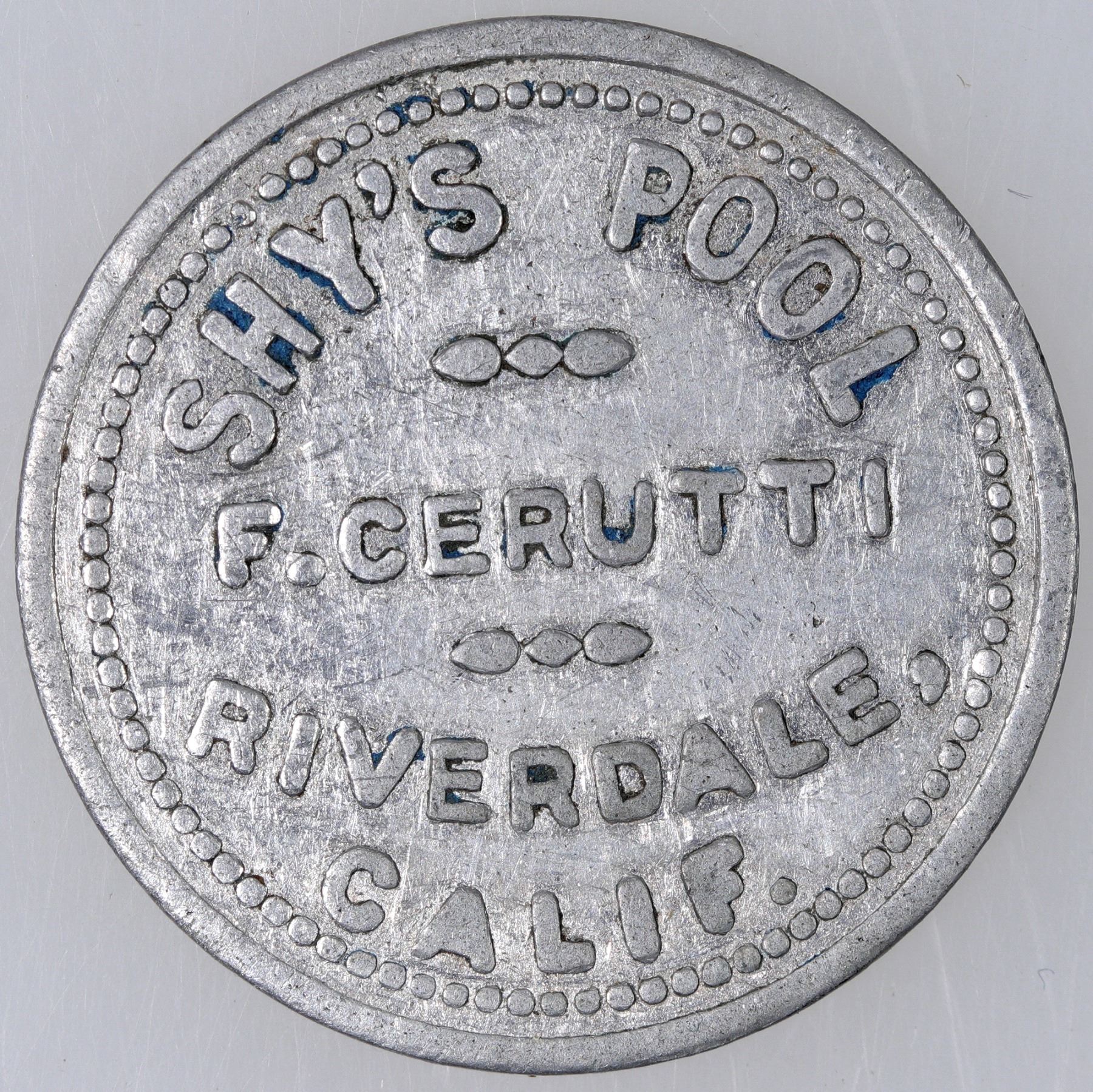 Rare Fresno County token: SHY'S POOL / F. CERUTTI / RIVERDALE. / CALIF. // GOOD FOR / 10¢ / IN TRADE; Al, rd., 22 mm. Nice condition. [Riverdale] [California]