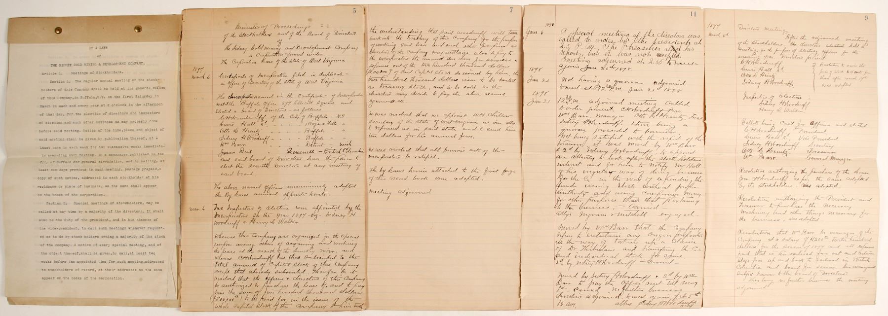 Interesting group of two documents for this mining company based in Buffalo, NY, and incorporated in West Virginia. 1898. Bylaws, typed, 7pp; corporate minutes, manuscript, 6pp. Frazier River was a famous placer gold district, discovered in 1857.