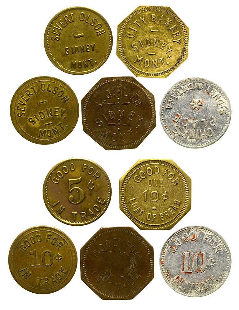 Five tokens. Severt Olsen (2), City Bakery, L J Huth, Chink's Place. (Svoboda Collection) City: Sidney State: Montana Date: HWAC# 35946