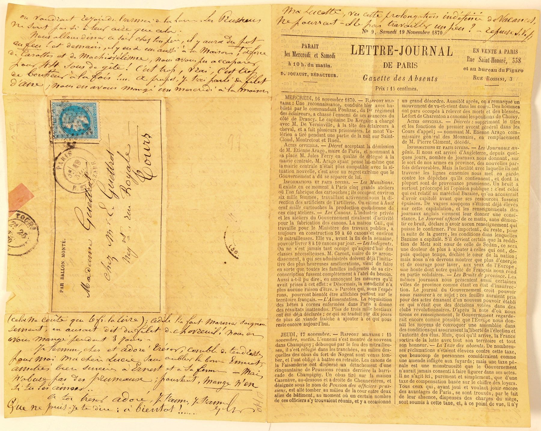 An article from the Lettre-Journal de Paris, 19 November 1870, two pages in French with handwritten letter also in French addressed to Mr Guettrot in Tours.