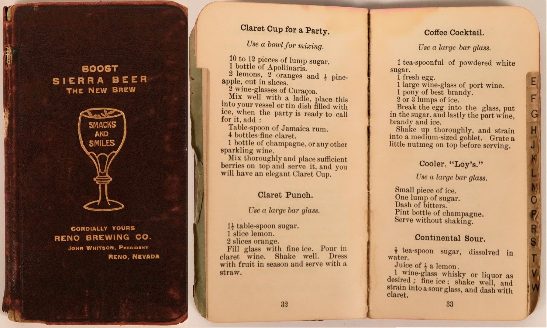 "Smack and Smiles: How to Mix Fancy Drinks and Beverages", Tenth Edition, 1907, by Charles Smith. Cover has advertising for Sierra Beer from the Reno Brewing Co., John Whitson, President. 4.5 x 2.5" 128 pp. Stains, scuffs. The Reno Brewing Company operated 1903-1957. The first brewery was 2-story and located at 990 E. 4th Street, In 1905, they completed a new 6-story facility. A new bottling facility was produced in 1910. With Prohibition, they converted to soda water in 1918, resuming beer in 1933. For more info, please see Volume One of the Nevada Bottle Book.