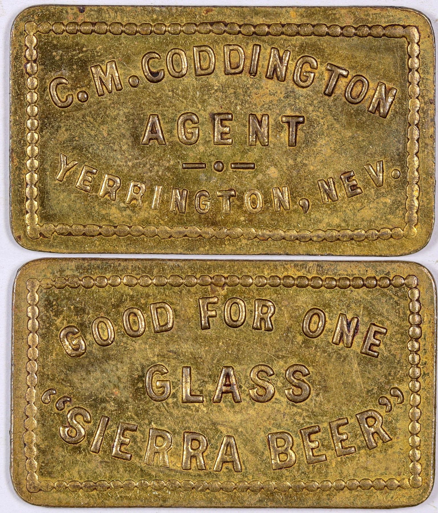 Obv.: C. M. Coddington / Agent / Yerrington, Nev.; Rev.: Good For One / Glass / "Sierra Beer"; Br., rectangular,, 33 x 20 mm. Uncirculated.
