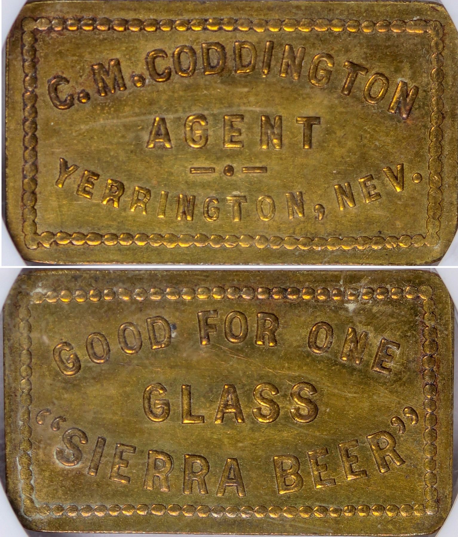 Finest known! NGC certified MS 62. Obv.: C. M. Coddington / Agent / Yerrington, Nev.; Rev.: Good For One / Glass / "Sierra Beer"; Br., rectangular, 30 x 22. Holder has a scratch on the obverse.