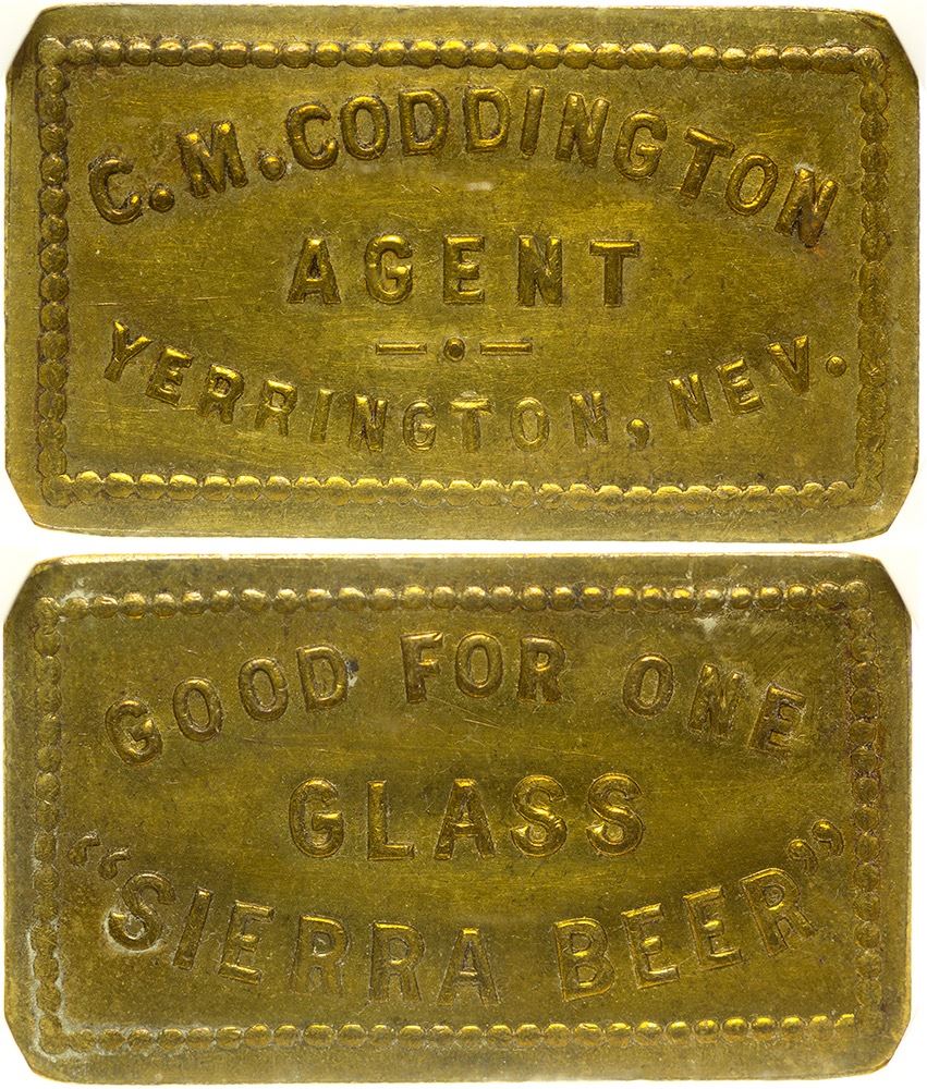One of the all time great beer tokens for "Sierra Beer" from Yerington NV c. 1905. C.M. Coddington / Agent / Yerington, Nev // Good For 1 / Glass / "Sierra Beer". Rectangular, Brass, 20mm x 34mm. MS 62. City: Yerington State: Nevada Inventory Number: 38932