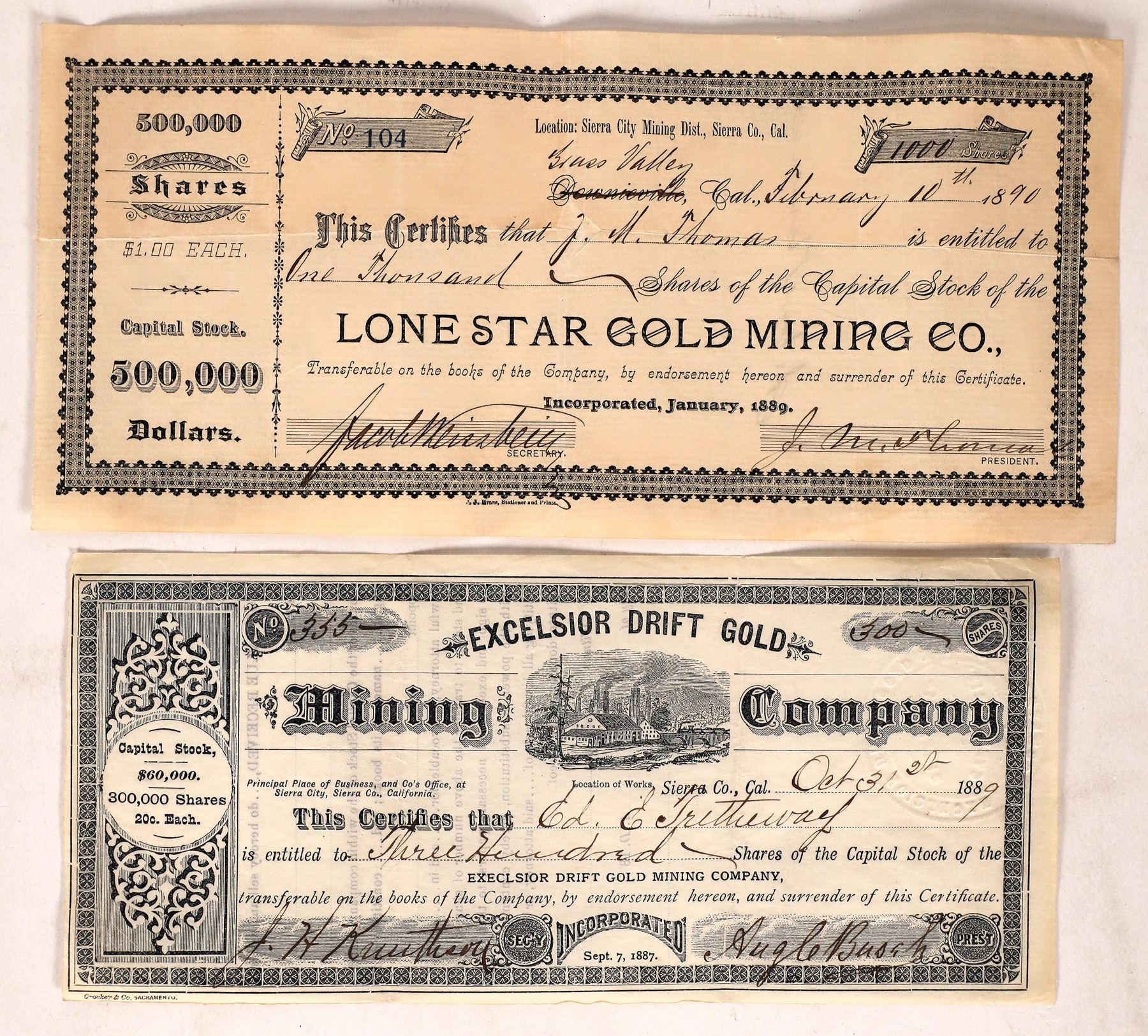 2 Sierra City mining stocks, both issued. 1890 Lone Star Gold, 1889 Excelsior Drift Gold. Sierra City California