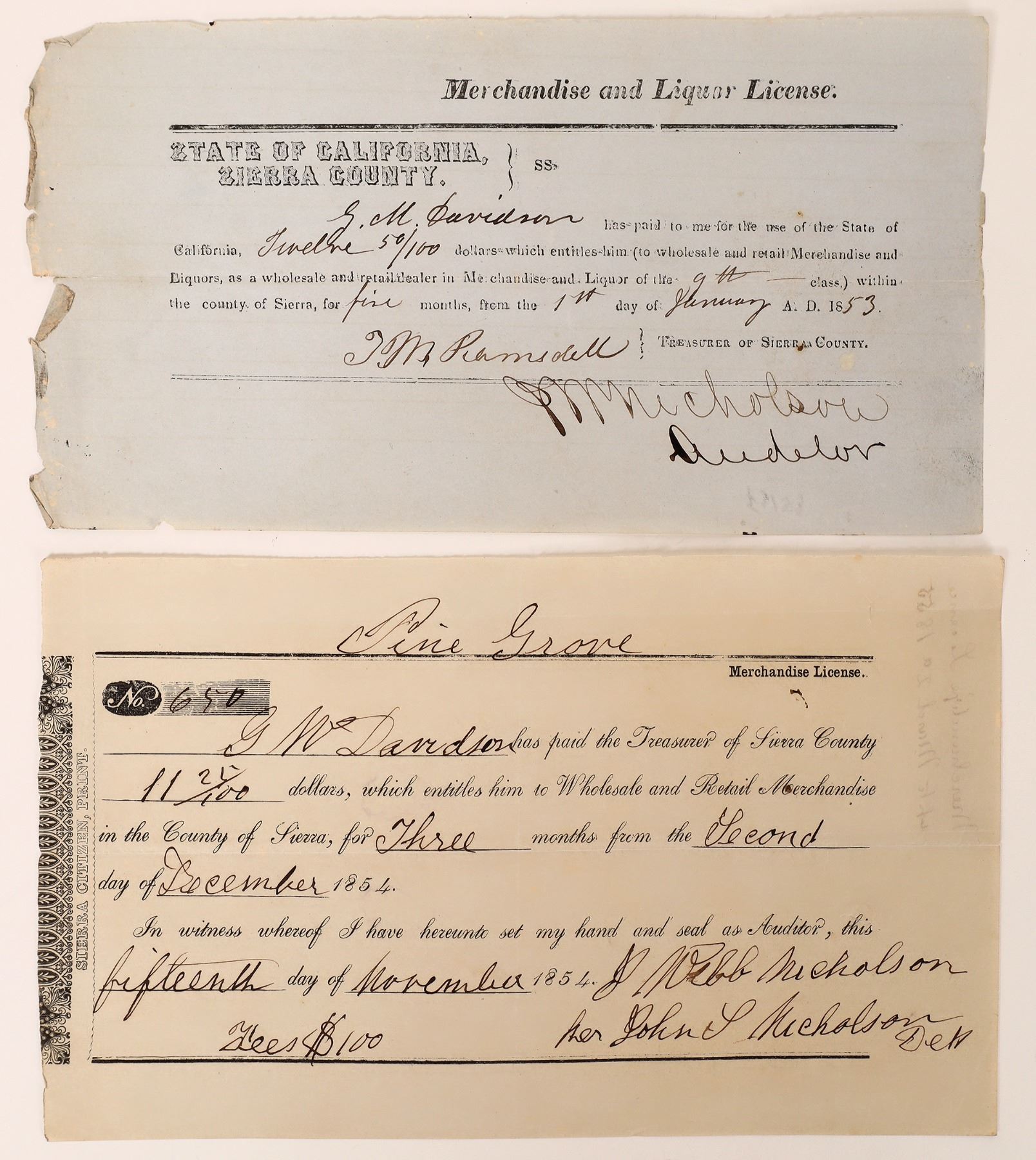 Two VERY RARE documents from Sierra County, CA. First, we have a merchant & liquor license issued to G.M. Davidson, costing $12.50 for a five month period, starting on January 1, 1853.