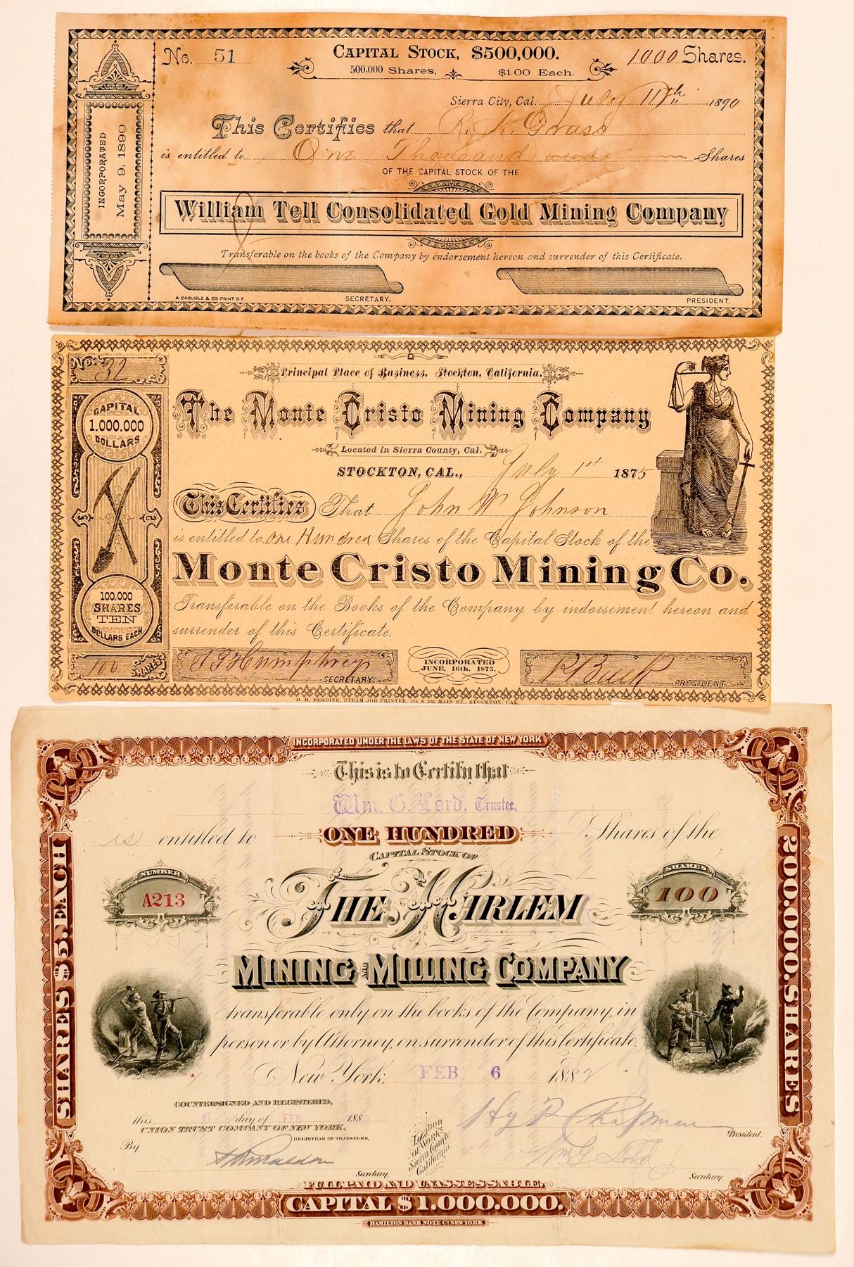 Lot of 4 different. 1) The Monte Cristo Mining Company. Issued in 1875. "Located in Sierra County, Cal." printed on cert. Not cancelled. Black border and print. Vignette of mining pick and shovel (left) and allegorical woman (right). Heavy toning. 2) The Mountain Messenger. Issued in 1895 in Downieville. Not cancelled. Sierra County newspaper. 3) The Harlem Mining & Milling Company. Location printed at bottom center. Issued in 1882 to the company secretary. Not cancelled. Brown border and two mining vignettes. Pinholes, folds, creases. 4) William Tell Cons. Gold Mining Co. Issued in 1890 in Sierra City. Possibly not signed. Heavy toning and soiling, tape repairs. Please inspect. Ken Prag Collection