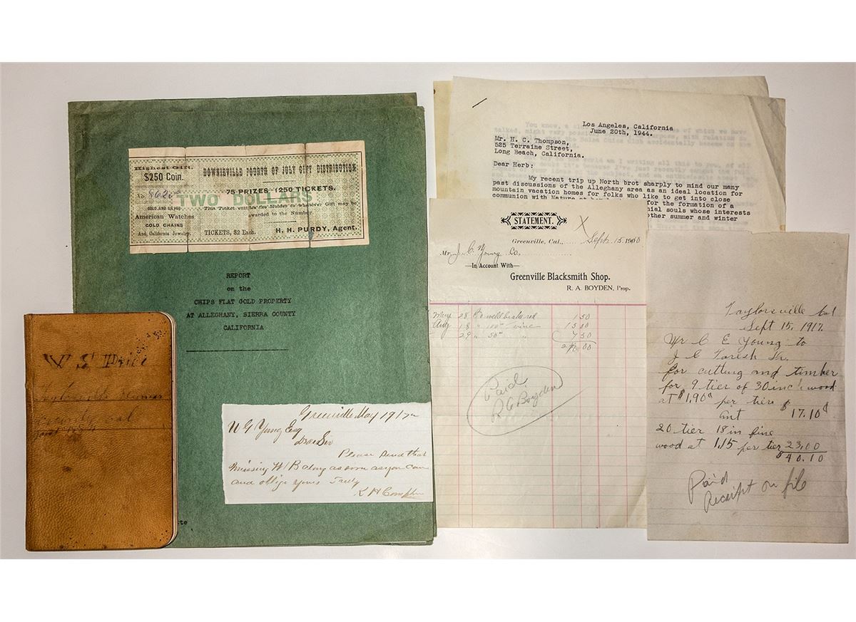 Eight pieces of Sierra County history: hand written weather log for Taylorsville, believed to be 1884, items from Greenville, Downieville and two mining reports on the Chips Flat gold property at Alleghany.