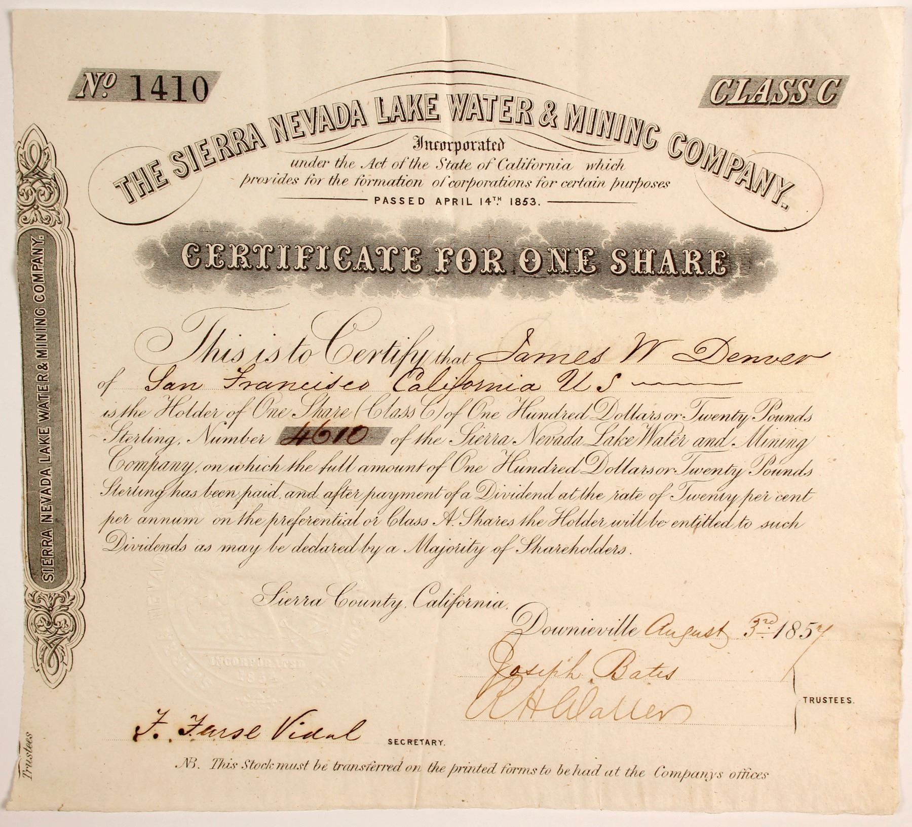 # 1410 issued to James W Denver. English style stock certificate. Signed by Joseph Bates and R. H. Walters. Denver was an American politician and lawyer. He served in the California State Government, was an officer in the United States Army, served in the United States Senate, and was Governor of the Kansas Territory during the struggle over whether or not Kansas would be open to slavery. The town of Denver, Colorado is named for him. Not cancelled. Cut unevenly. Excellent condition. Prag Collection