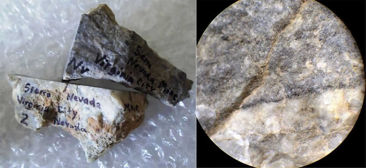 Gold in hand specimen from the Comstock, collected by a major Nevada gold geologist. Two specimens from the famous Sierra Nevada Mine, in the gut of the Comstock on the north end. Contains black silver sulfide bands in epithermal calcite and silica. Largest is 2.25 x 1.75 x 1" State: Nevada City: Virginia City Date: FHWAC#: 42229