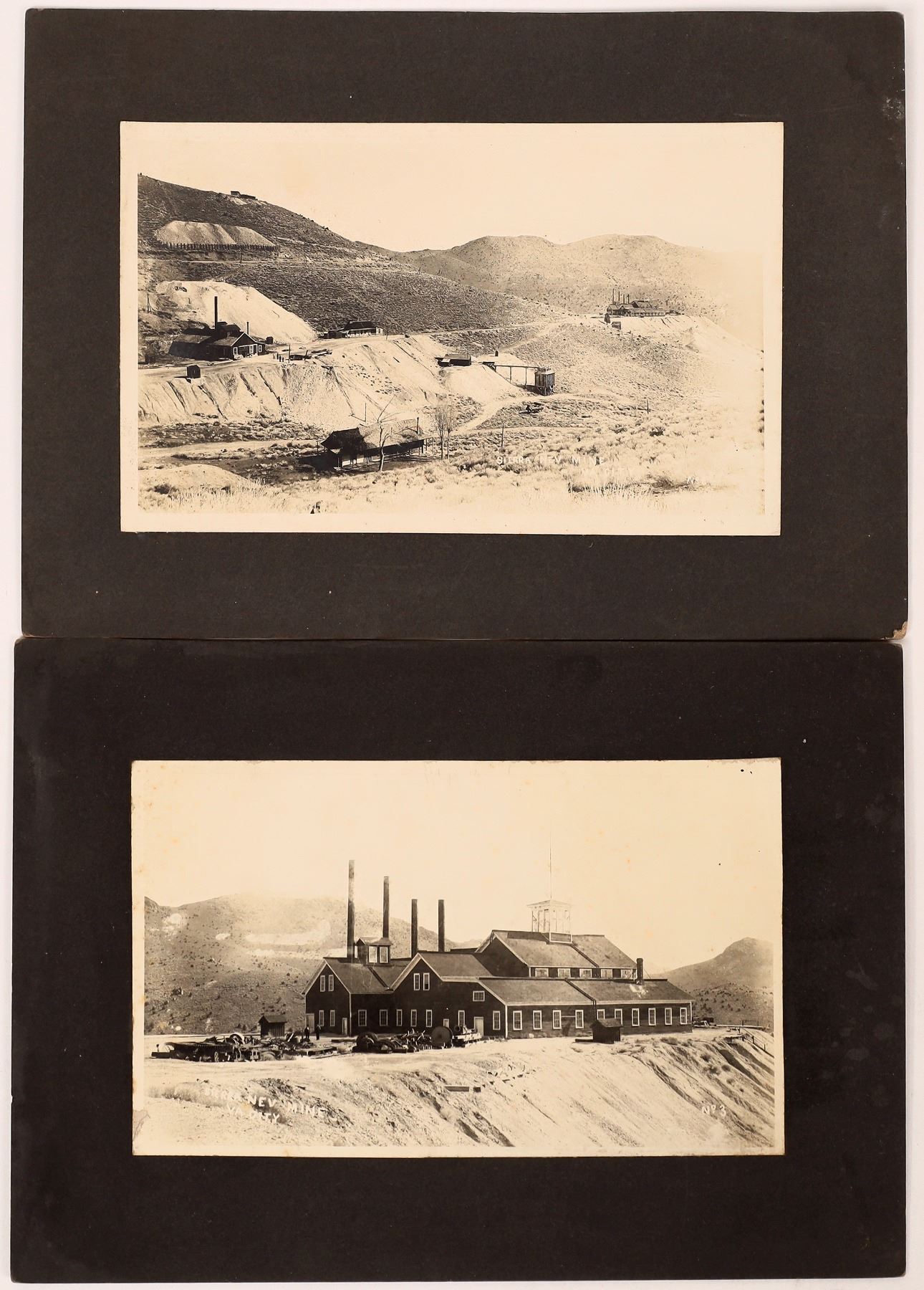 Lot of two different from a series of Comstock photographs taken about c.1900 from an unidentified photographer. These two identify the mine in white ink on the photo. The first shows the Sierra Nevada in the background to the right, with probably the Utah Mine in the foreground on the left. The second is a close-up view of the Sierra Nevada. Both are 5 x 8" photos on 7.75 x 10.75" boards. Good contrast and sharp focus. Foxing, some stains. The Sierra Nevada Mine was located on the north end on the Comstock in Sevenmile Canyon and was its second largest producer. First staked in 1859. Located on the south side of the canyon below the Utah Mine. In the late 1870s, the stock soared when ore was found that was assaying at $300 per ton. When no profitable returns materialized, the stock crashed, which Ansari states "marked the end of the Comstock stock market bonanza days."