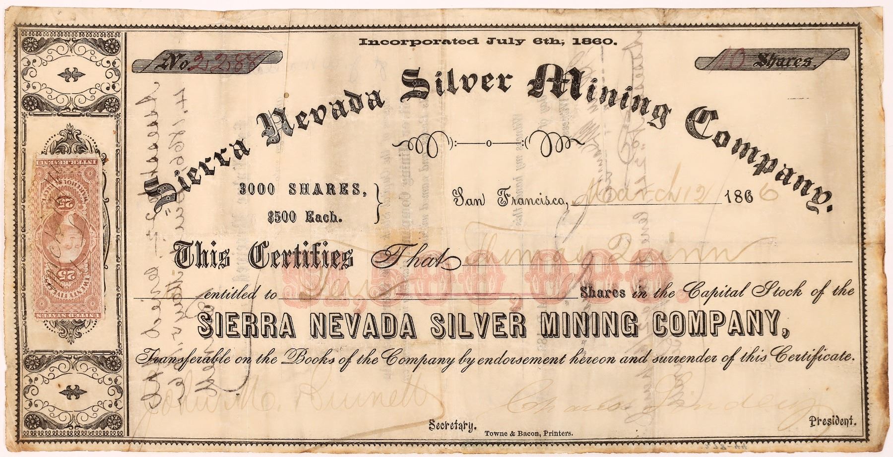Sierra Nevada Silver Mining Company Stock - This mining company was incorporated when the Comstock was still part of the Utah Territory. Incorporation date was July 6, 1860. Very Early! Number 2288 for ten shares to Thomas Quinn. Datelined San Francisco 1866. Signed by John M Burnett(?) Secretary, and President, Charles Lindley(?). 25-cent Warehouse Revenue stamp. Printed by Towne & Bacon. No cancelled. Ob reverse recording of assessment #22 Apr.4, 1866 paid an another assessment No.24 paid. Wrinkled, vertical and horizontal folds and fading. Still a very special stock certificate whose date of incorporation will remain one of the earliest! Original trustees were TJ Andrews, JD Wilson, Joseph Lambert, George O. Whitney and William M. Stewart. Stewart would become the most influential citizen as lawyer for most of the major mining companies on the Comstock. The Daily Alta California of July 13, 1860, lists the following Comstock mining companies as the earliest to incorporate in San Francisco: Washoe, Chollar, Ophir, Buckeye, Gould & Curry, Scorpion, Yankee Silver, and Sierra Nevada. Many others are active, according to the paper, but have not yet incorporated!