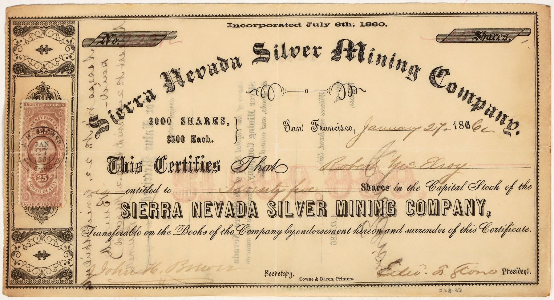 Very rare. Key mine on the north side of the Comstock. This mining company was incorporated when the Comstock was still part of the Utah Territory. Incorporation date was July 6, 1860. Very Early! Number 2224 for 25 shares to Robert McElroy. Datelined San Francisco 1866. Signed by John M Brewer(?0 and president Edward Stone. 25-cent Warehouse Revenue stamp. Printed by Towne & Bacon. Not cancelled. Folds, toning. 5 x 10" Original trustees were TJ Andrews, JD Wilson, Joseph Lambert, George O. Whitney and William M. Stewart. Stewart would become the most influential citizen as lawyer for most of the major mining companies on the Comstock. This mine was the second largest producer in Sevenmile Canyon, located below the Utah Mine.