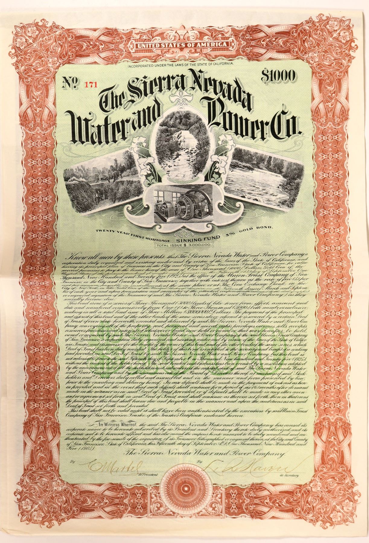 $1,000, 20 yr. First Mortgage sinking fund, 5% gold bond due 1925. Four nice vignettes of a river, stream, hydroelectric equipment and men surveying a river channel. The company's properties were located in Amador, Alpine and Calaveras Counties. The company failed in 1910 and their operations were taken over by the Sierra Blue Lakes Water & Power Co. The bond has been folded. Coupons attached.