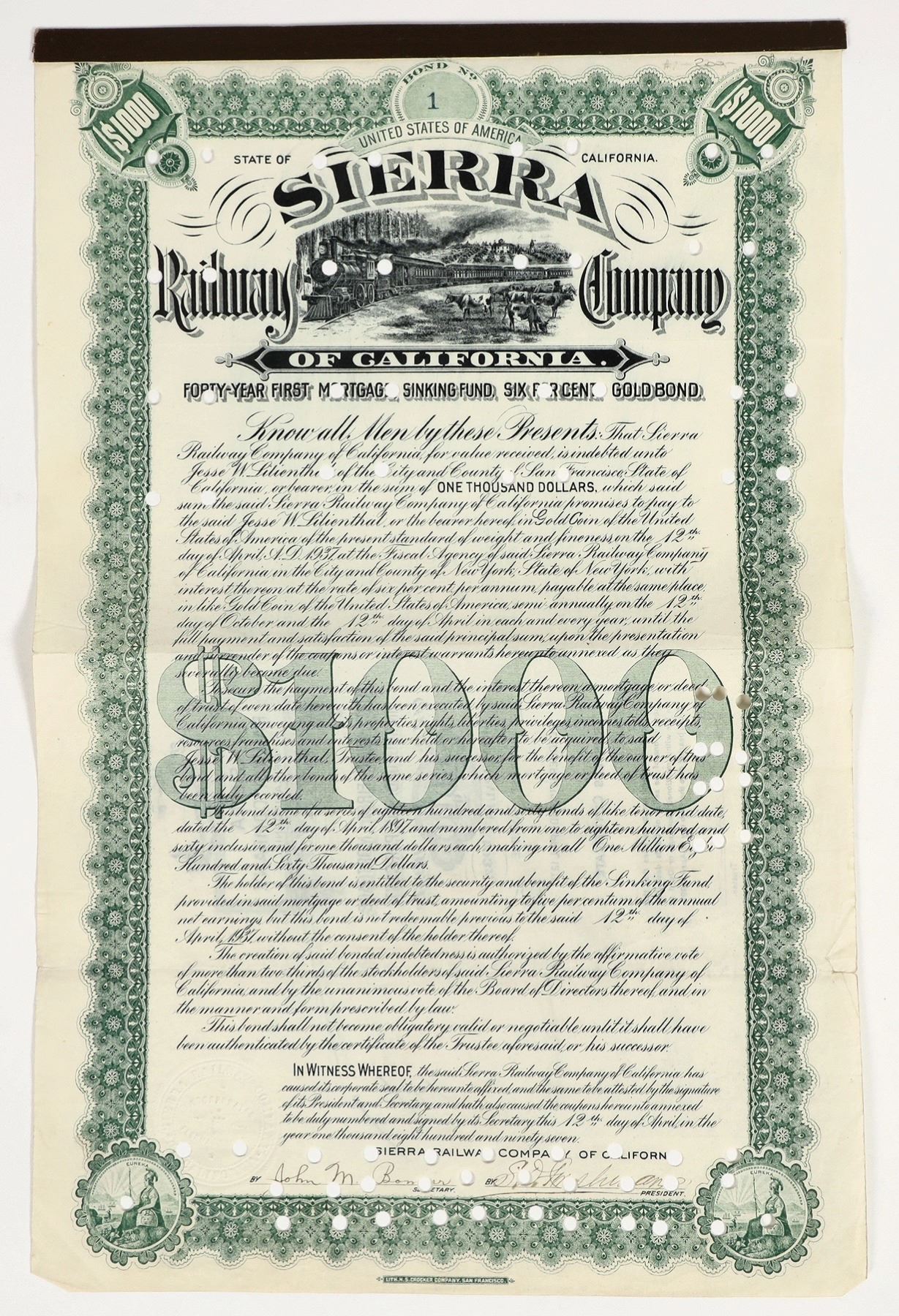 #1, I/C. Sierra Railway Co. of California, $1000, 6%, bearer bond, issued 1897, due 1937. "$100" green underprint, vignette top 4-4-0 passenger train. Embossed corp. seal, no coupons. . H.S. Crocker & Co. printer. VF cond. The Sierra Railway Company was conceived as the solution to connect the gold and minerals, plus the timber and lumber resources located in the Central Sierra Nevada to the national rail transportation network. Investors, Thomas Bullock, Prince Andre Poniatowski, and William Crocker financed a rail line from Oakdale toward Tuolumne County and eventually Calaveras County.