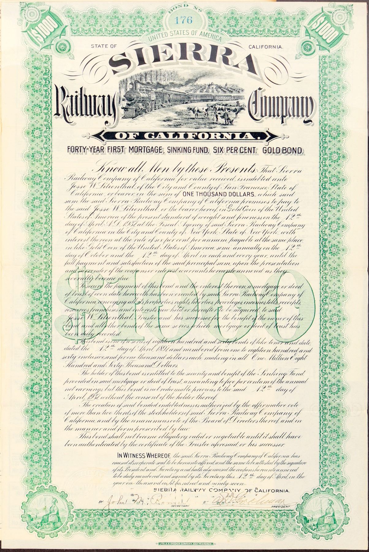 Two of 1860 authorized1000 6% 40 year First Mortgage Sinking Fund gold bearer bond due 1937. Issue dates of April 12, 1897, GREEN, state seal in lower corners, $1000 in upper corners, vignette of 4-4-0 passenger train passing pastures, "$1000" green underprint. #176 I/C, embossed seal, coupons attached missing 1-49, hole punched "CANCEL" on certificate and coupons, no other marks, tears or stains, fold lines, H.S. Crocker Co printer. #1494 U/U, all coupons attached, condition is AU, Mutual Label & Lith Co printer. Ken Prag Collection