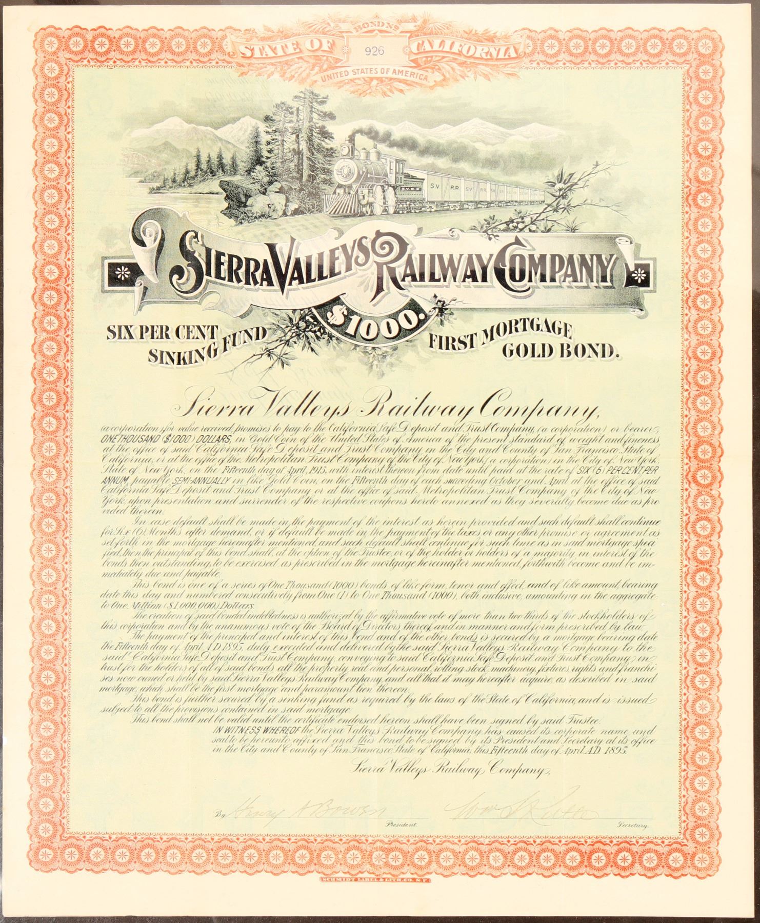 Sierra Valleys Railway Co. #926 of 1000 authorized, I/U, $1000 6% Sinking Fund First Mortgage Gold bearer bond. Issued April 15, 1895 and due 1915, signed Wm. L Kiettle President., RED, no seal, vignette top center 4-4-0 train box cars w/SVRR on sides, all coupons attached, evidence of folds, no tears, stains, or holes green underprint, Schmidt Label & Litho Co printers. Stock is listed in, however no bonds are found Cox or found in other reference sights for this company.. Possibly only one known to exist. Ken Prag Collection
