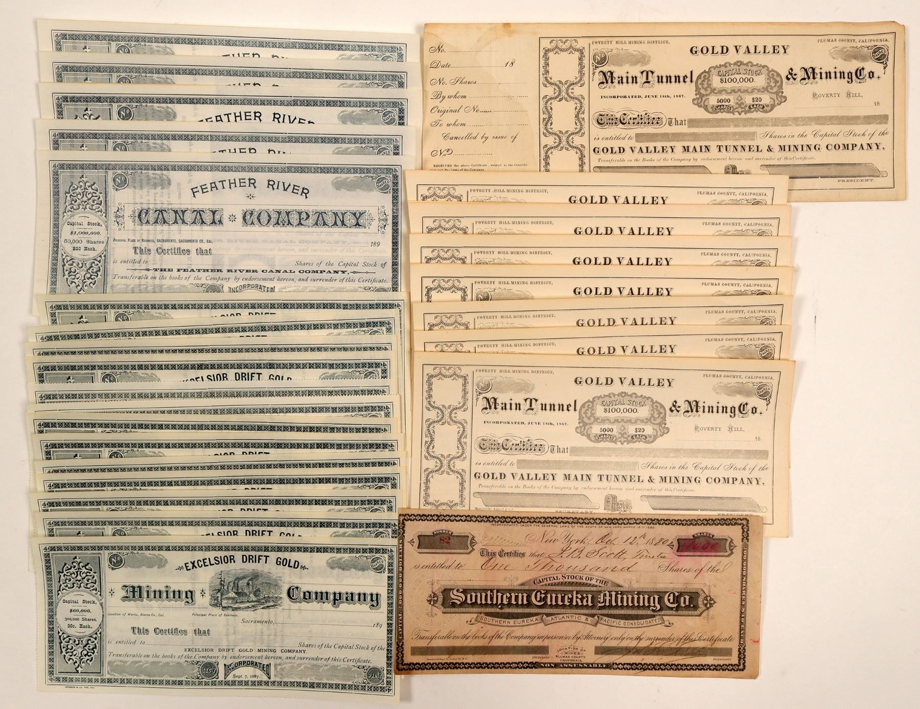 Approx 25 mostly unissued stocks. Southern Eureka Mining, Gold Valley Main Tunnel and Mining, Excelsior Drift Gold Mining Ken Prag Collection