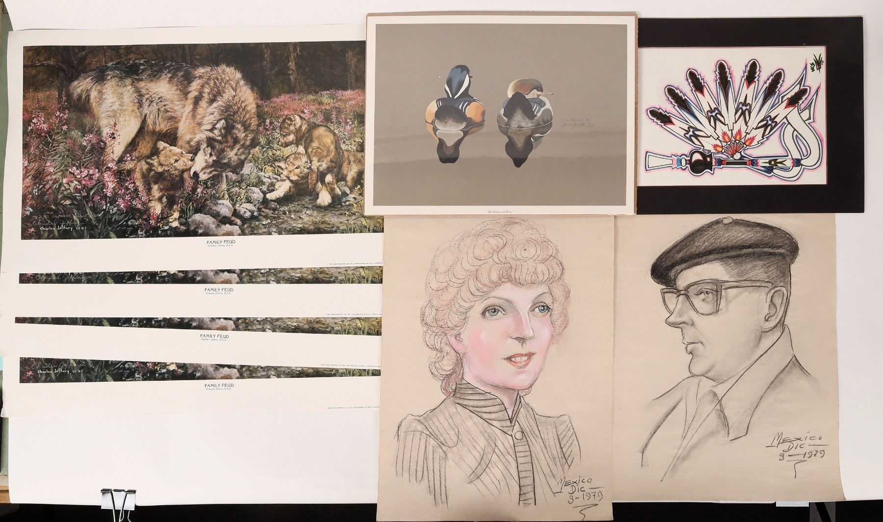 8 signed pieces of art. Just Coming and Going, by Land Hartzell, #63/600. Original "Feathers", VCS 1982. Man in Beret and Lady by DIC, Mexico 1979. 4x Family Feud by Charleen Jeffrey-some corner wrinkle on lower left. 11.5x8.5" -14.75x25.5".