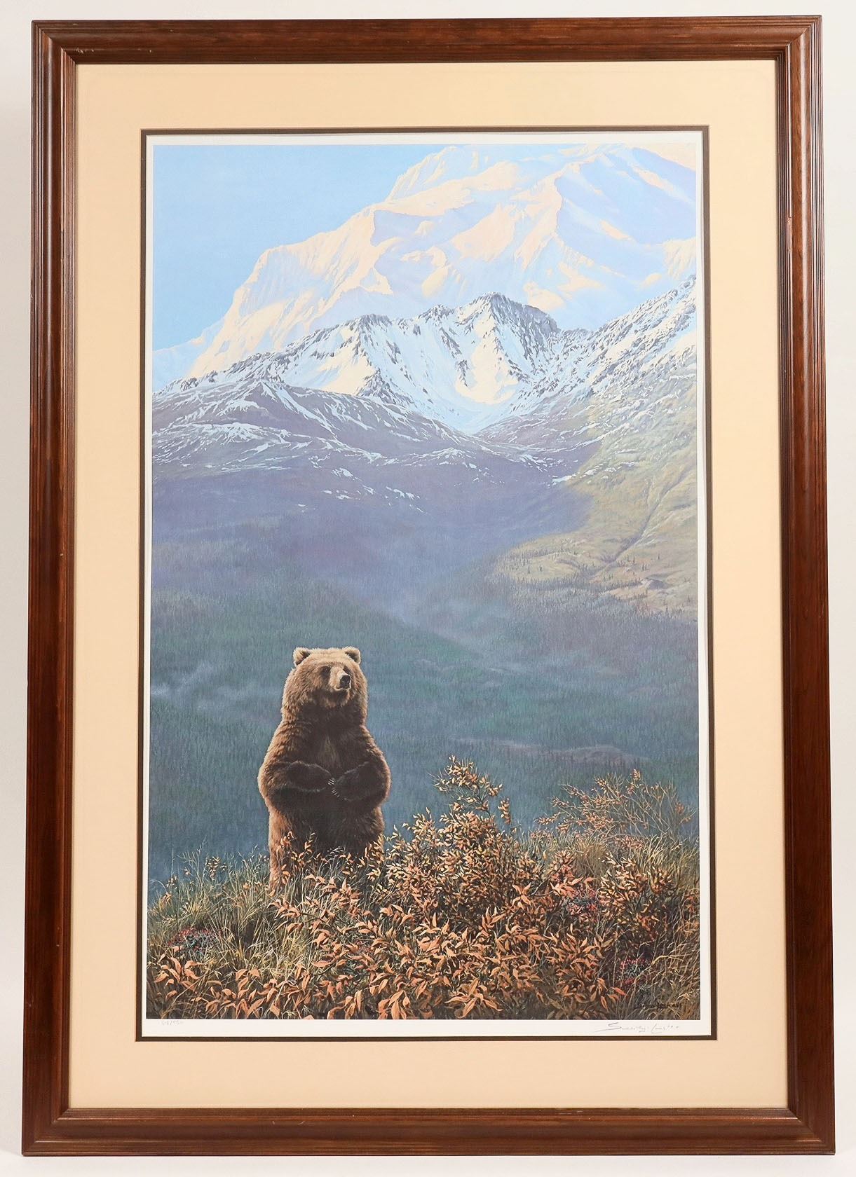This is a print from British artist John Seerey-Lester, entitled "High Country Champion-Grizzly." This matted and framed print measures 30"x 44" and is ready to hang.
