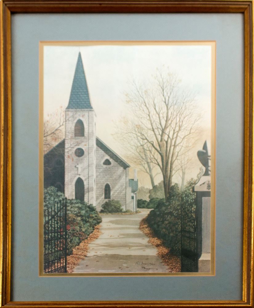 Signed and numbered print of a church by E. H. Burger, 83/250. 16.5" x 11.5", matted and framed 23.5" x 18.5". "E. Howard Burger was born in Athens, Tennessee, in 1915. After his father passed away when he was 11, he started his art career by lettering store windows. After obtaining his degree from George Washington University, he began work in Washington, D.C., as a commercial artist and engineer. After a successful 32 year career, he retired at age 58 to begin work as an artist. He started a gallery in Cleveland, Tennessee, which he later passed on to his son. Burger passed away in Whispering Pines, North Carolina, in 1995, where he painted until his death. Much of Burger's work consists of nostalgic pieces depicting farms which have seen better days. Other works were influenced by family life and golf. Burger also had pieces commissioned for posters for the 1982 World's Fair in Knoxville, Tennessee." Date: 1979 Location: Tennessee HWAC# 56846