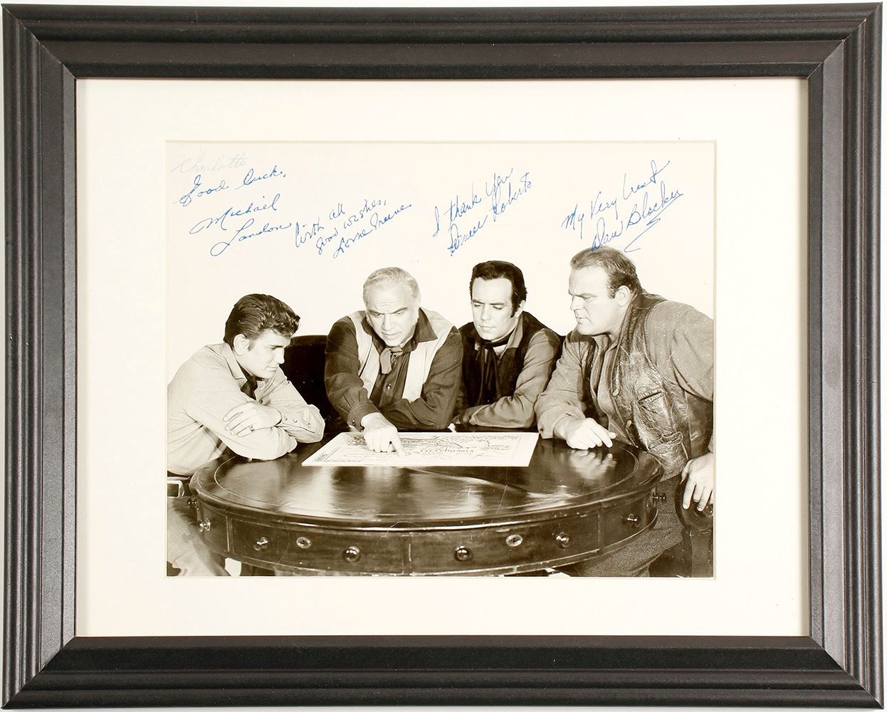 8" x 10" b/w Bonanza Promo photo signed by Michael Landon, Lorne Green, Pernell Roberts and Dan Blocker. Photo has some creasing. HWAC# 61376 Date: Location: Virginia City, Nevada