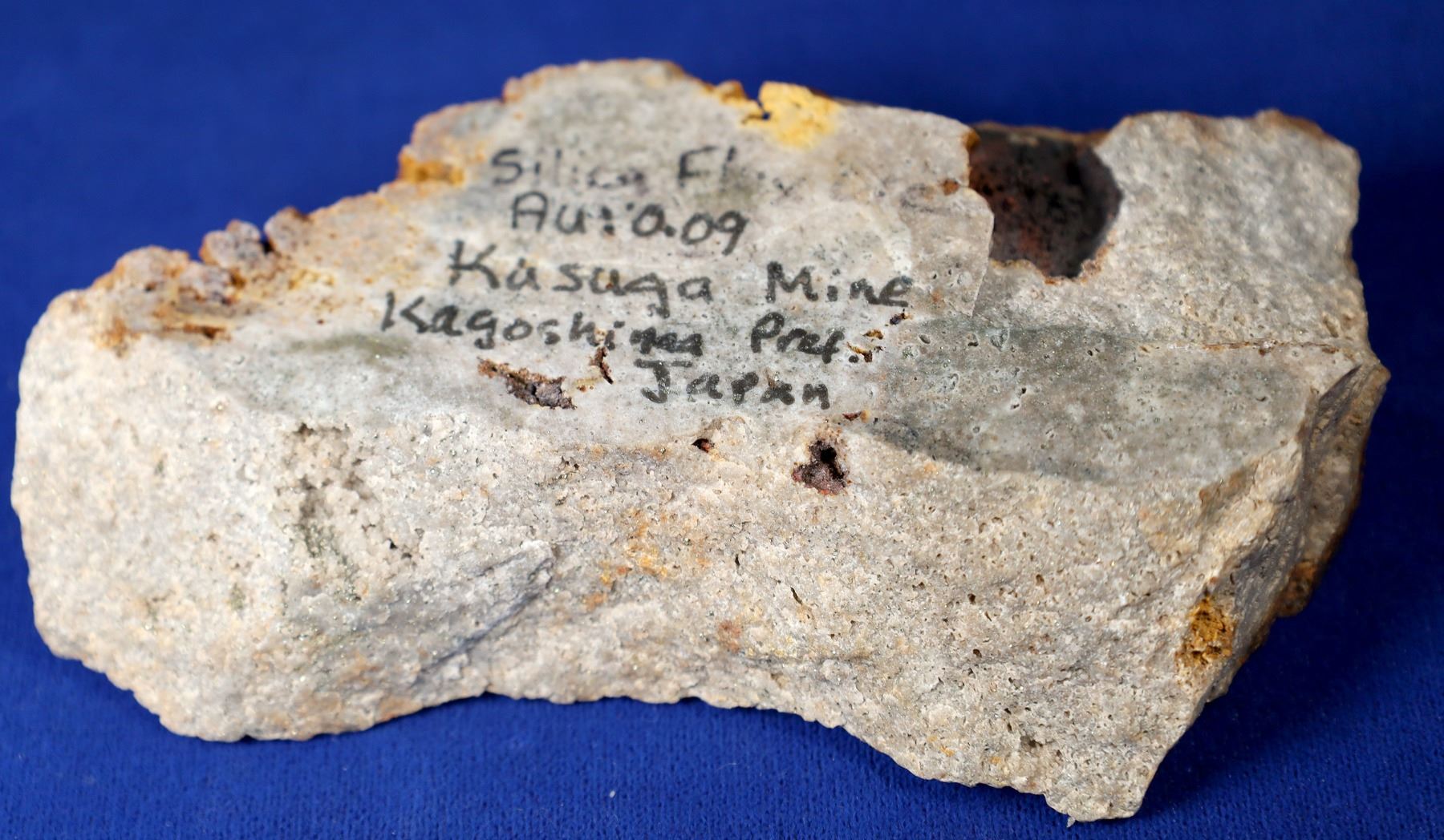 A large sample of silica flux ore that has gold content of 0.09 oz/ton. This material could be used in the smelting of precious metal ores to help remove impurities while contributing a small amount of gold to the final product. This specimen is approx 5.25 x 3 x 1.25 inches and weighs about 370.4 grams.