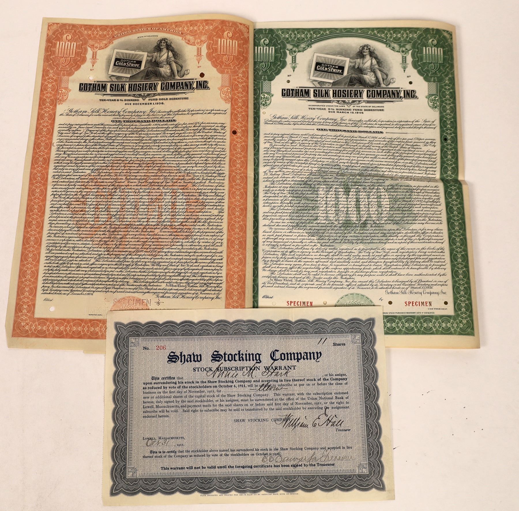 Lot of 3. 1. Shaw Stocking Co., incorp. Mass. #206, I/U, 11 of stock subscription warrant. Issued Oct, 1911. Blue, no vignette, American bank Note Co. VF. 2. Two bonds Gotham Silk Hosiery Co, Inc., I/C. $1000, 10 year, 6%, Specimen w/20 coupons. Orange, Vignette allegorical female holding sign “Gotham Gold Stripe”. EF. $1000, 5%, 10 year, Green, w/19 coupons, specimen, same vignette. VF. Hamilton Bank Note printer.