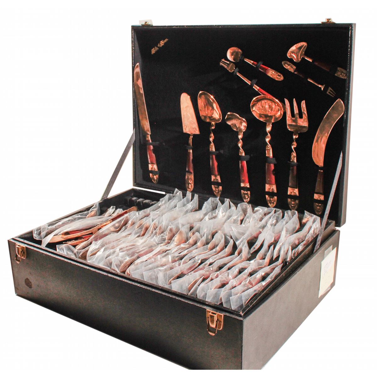 Unique handcrafted vintage serving set with ebony handle and a stamped Buddha image with SIAM on the end, by Star of Siam Bronze Ware. Most items still in original wrapping. 56 pieces. Ten small forks, 11 small spoons, 12 medium spoons, 12 larger spoons. A few pieces missing of the twelve piece setting.