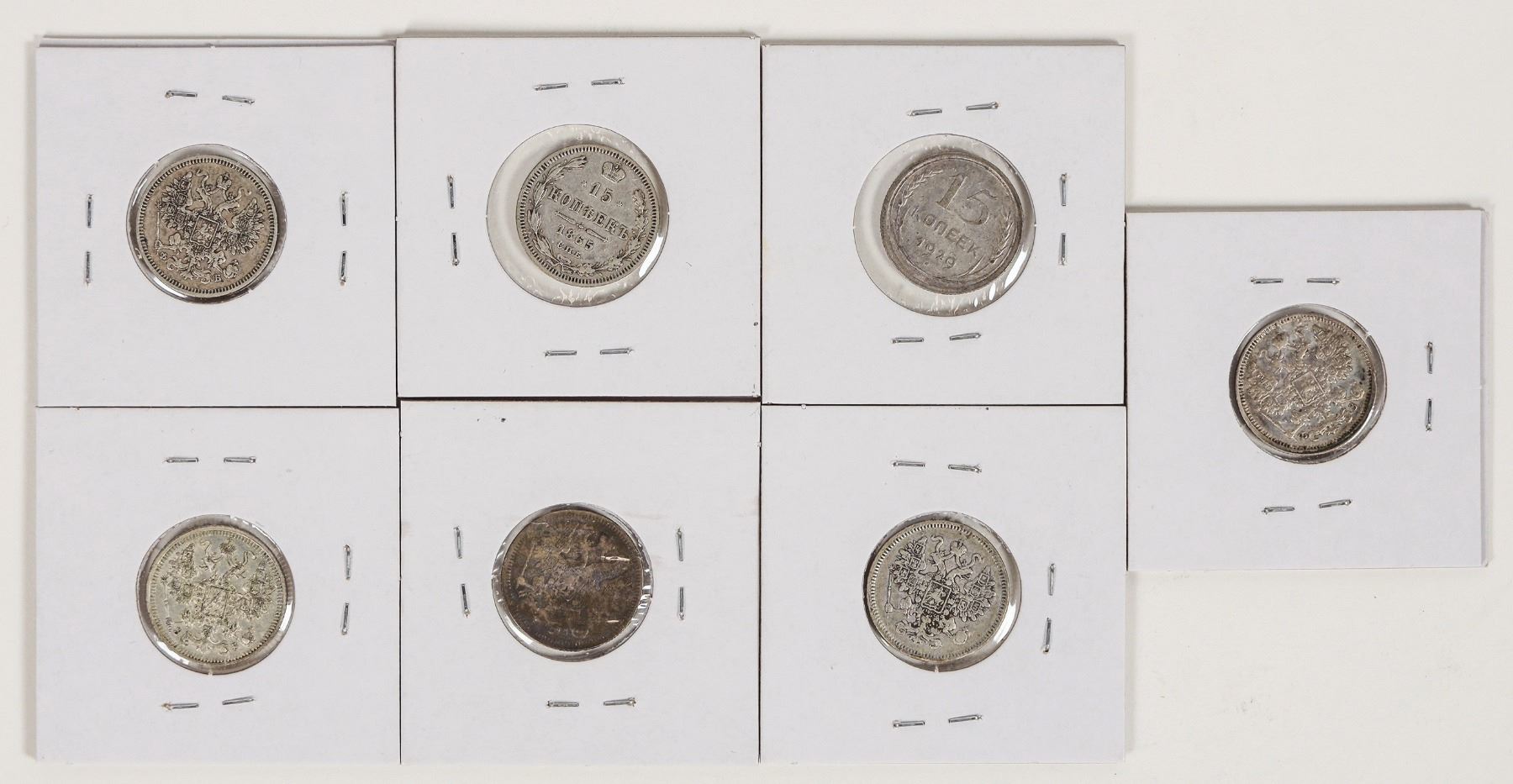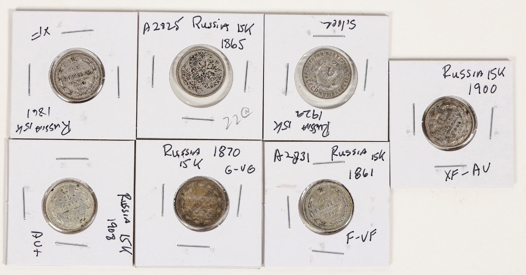 Seven 15 kopek Russian coins: 1861 F-VF; 1861 XF; 1865 F-VF; 1870 G-VG; 1900 XF-AU; 1908 AU; 1929 F-VF.