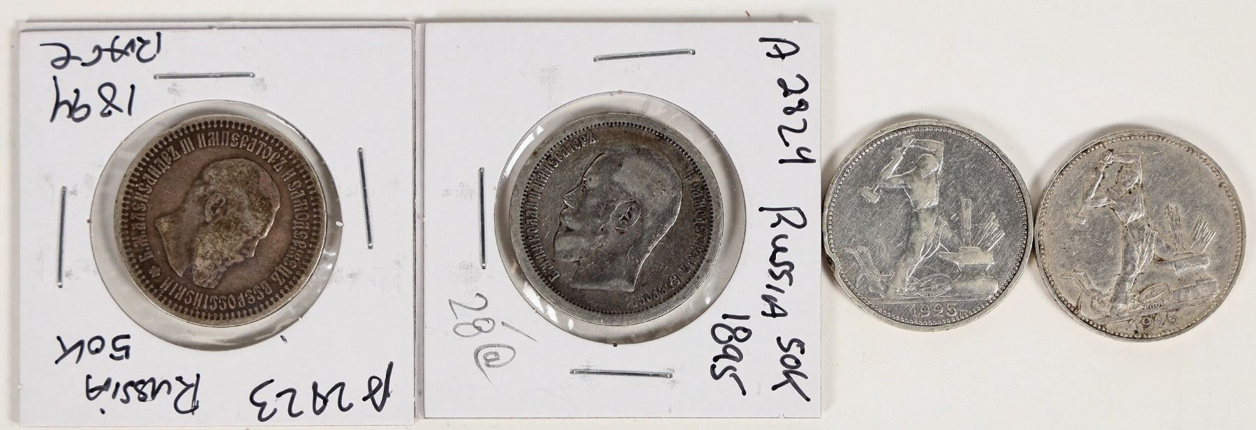 Four Russian fifty kopek coins: 1894 VG-F, 1895 VG-F, 1925 VF-EF and 1925 AU-Unc.