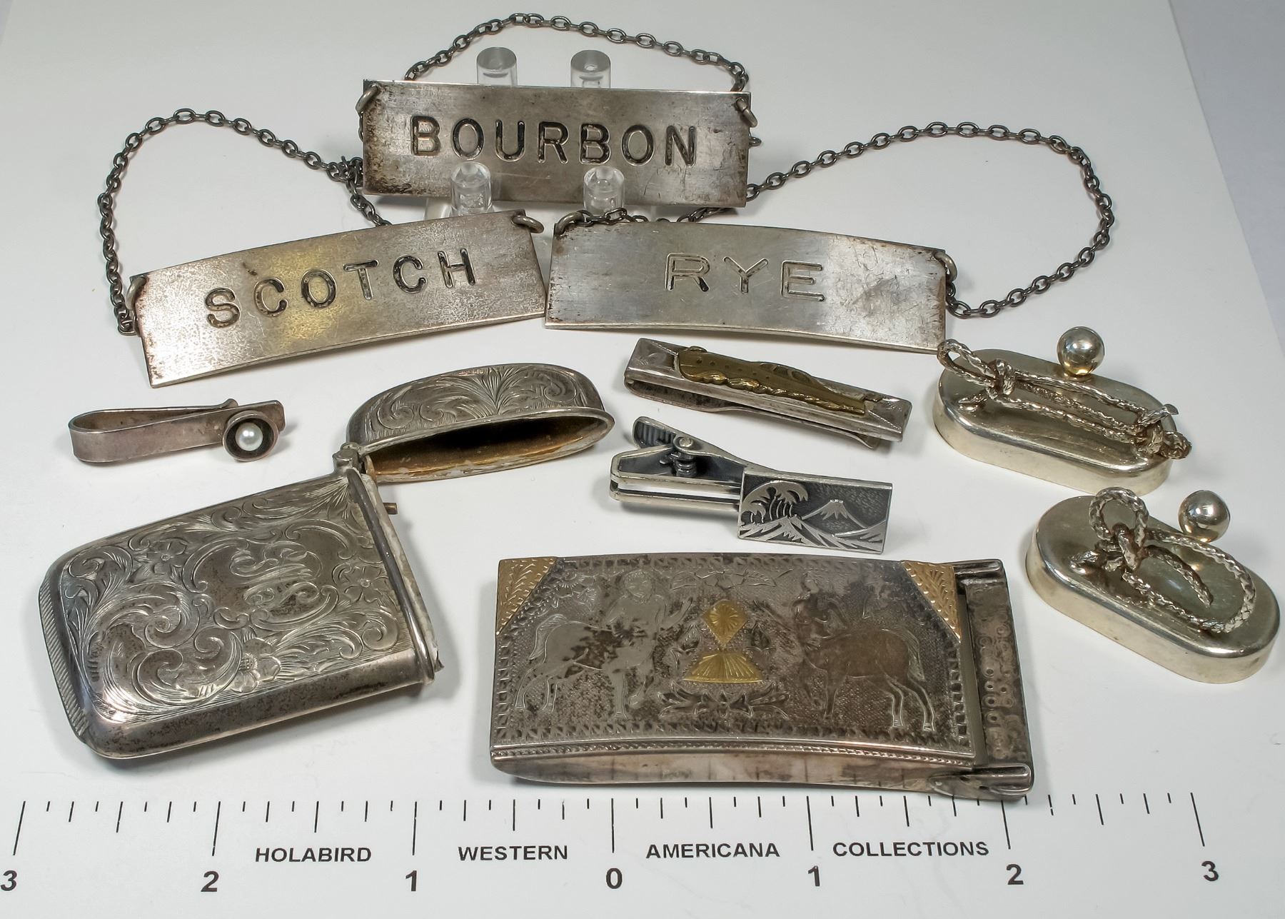 1) Engraved antique lighter cover—initials “GMS”. 2) Hand engraved belt buckle with gold touches. Image of male and female centaurs. 2.5” x 1.5". 3) Antique gold plated and silver tie clasp. Image of sleek boat in water. 4) Embossed silver tie clasp. Image of Mount Fuji. 5) Taxco Mexican silver tie clasp by Delfino. Silver set with pearl. 6) Two vintage Mayor’s silver lids (for snuff boxes). Each has a different knotted rope handle in silver. 1.5” x .75”. 7) Three B & M sterling liquor bottle tags with chains—Scotch, Bourbon, and Rye.