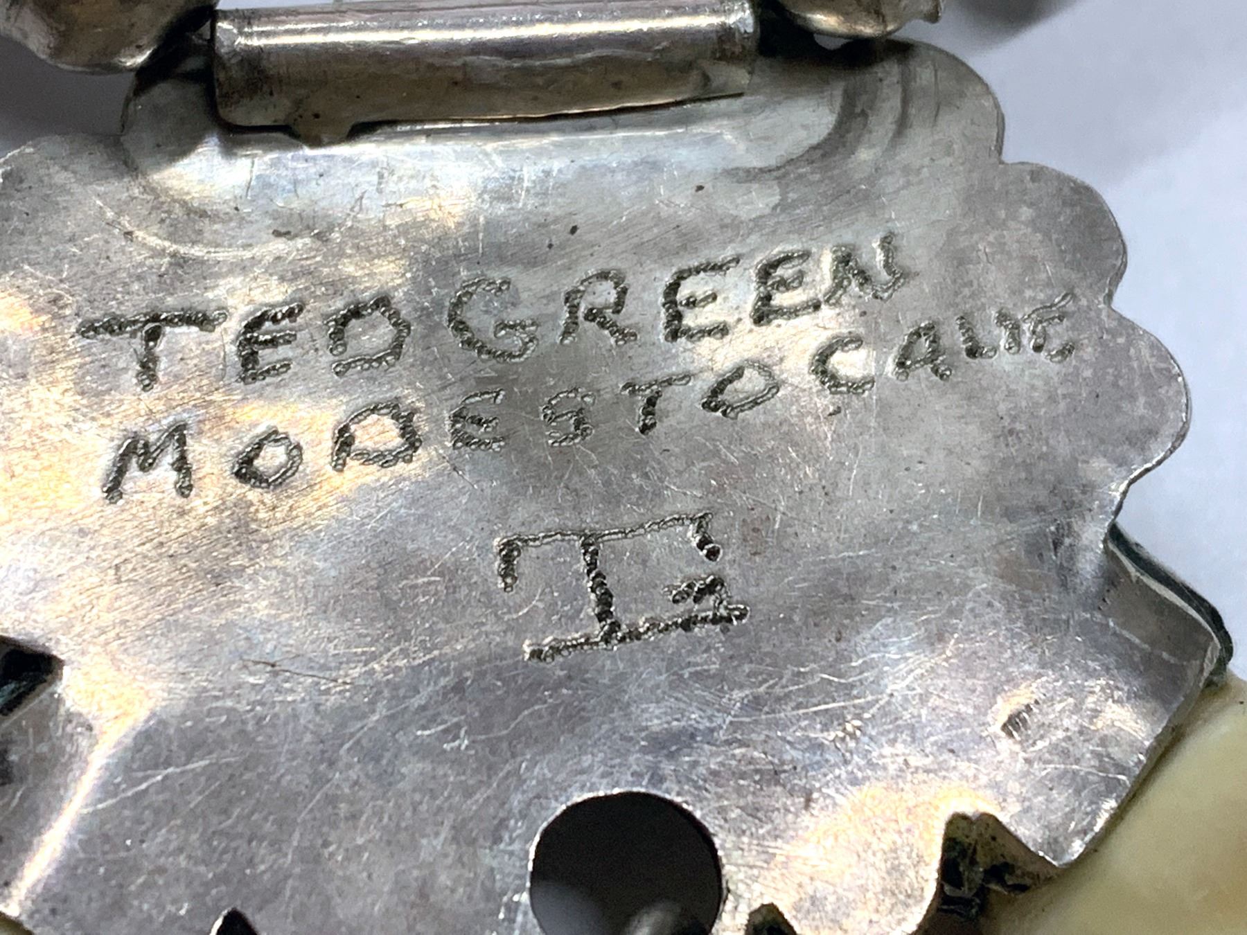 Hollow silver bead necklace with six bear claws capped with stamped silver and silver adornments. Central turquoise cabochon is set in silver with two large teeth and a coral drop. 20-inch long chain, pendant is 2.75 x 2.25 inches. Main pendant is engraved // TED GREEN / MODESTO CALIF // with a conjoined TG logo. The TG logo also appears in the silver on the back of each bear claw ornament. See photos for details.
