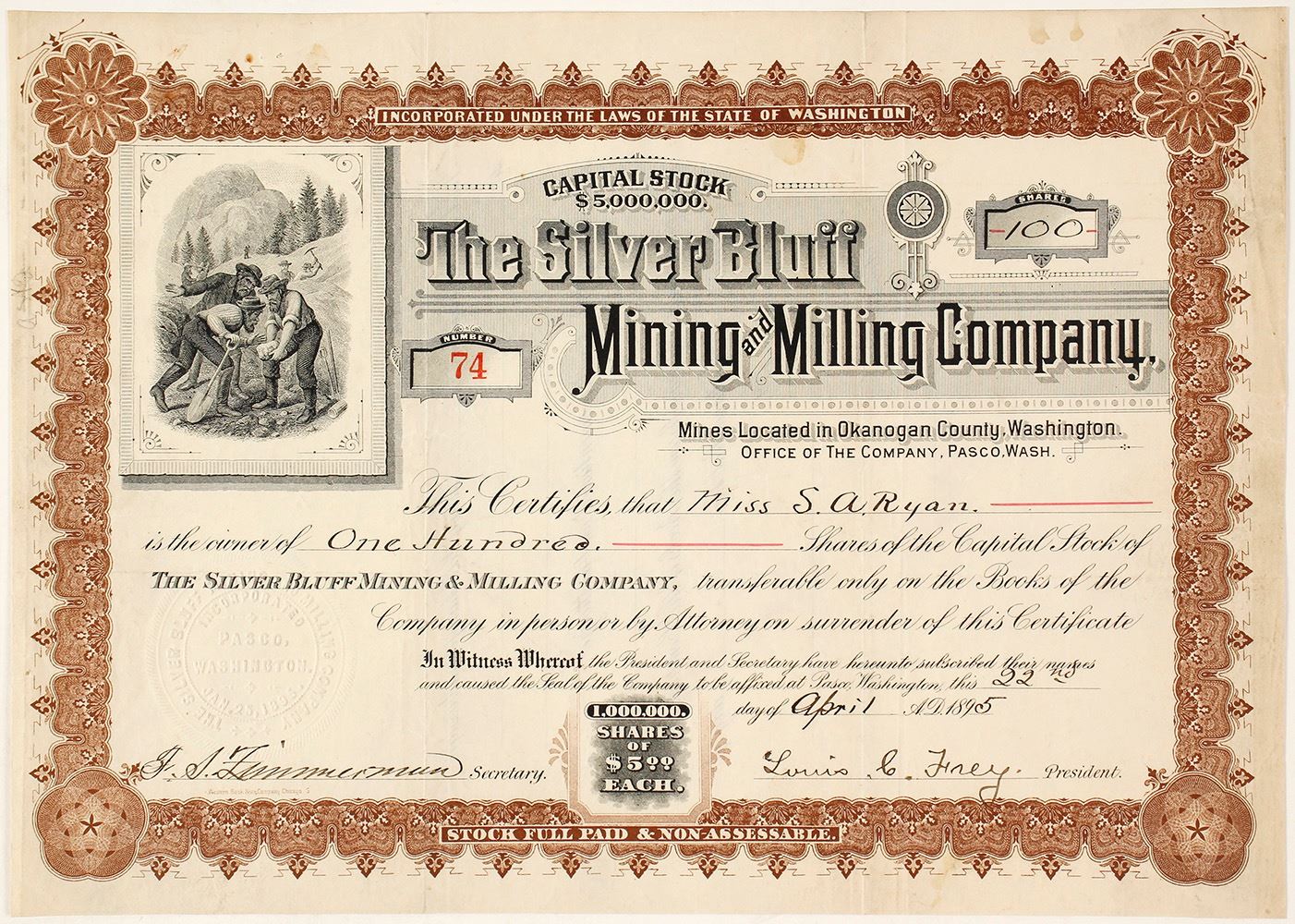 Inc. in Washington. No. 74, issued for 100 shares to Miss S.A. Ryan on April 22nd, 1895. Signed by Louis Frey, president, and Zimmermann, secretary. Not cancelled. Mines Located in Okanogan County, Washington (printed below logo). Company office at Pasco. Brown border and mining vignette. Folds, staple holes, a few stains. 8.25 x 11.75" Located on the Lime Belt, the Silver Bluff group consisted of 10 claims. (Al Adams Gold Rush Memorabilia Collection) Date: Location: Okanogan County, Washington HWAC# 59020