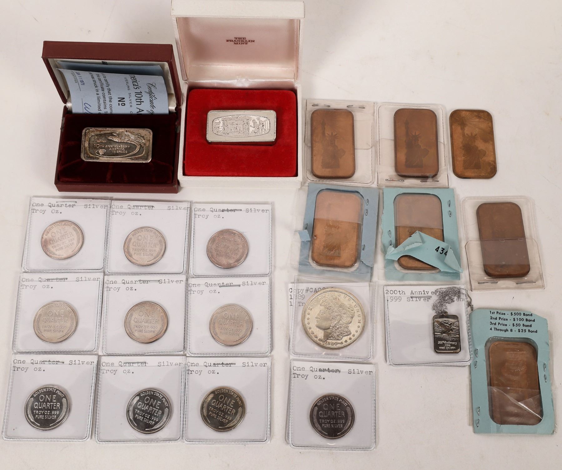 Lot of two silver ingots: 1) Franklin Mint Christmas 1978, 1000 grain sterling in original box; 2) Franklin Mint America's 10th Anniversary In Space, 1971, 1000 grain sterling in original box. Copy 1889 Morgan dollar made of one troy ounce .999 fine silver, proof condition. 5 gram (.16 oz ASW) silver pendant 200th anniversary with chain. Ten 1/4 troy ounce silver rounds, Indian Head 1929 obverse. Seven 1976 Nevada City Bicentennial brass ingots.
