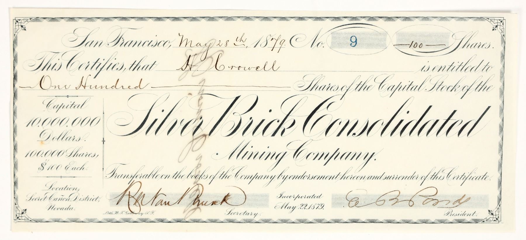 Very rare. Fantastic name for a Nevada mining stock! "Location, Secret Canon District, Nevada" (printed at bottom left). Inc. May 1879. Low number 9, issued for 100 shares to H. Crowell in May 1879. Signed by president EB Pond and secretary Bunk. Not cancelled. Black border and print. Lith. WT Galloway. Pinholes, clean. The Silver Brick mine was in Secret Canyon some 12 miles south of Eureka, Eureka County. It was a short-lived enterprise, with no trace visible today.