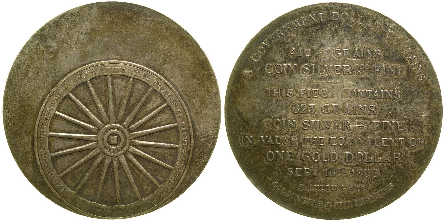 HK785, Schornstein 16. Obv.: In nine lines, first and last curved, others straight, "A Government Dollar Contains / 412 1/2 Grains / Coin Silver 900/1000 Fine / This Piece Contains / 823 Grains Coin Silver / In Value the Equivalent of / One Gold Dollar / Sept. 16th 1896 / Spaulding and Co. / Goldsmiths and Silversmiths." Obv.: On rim of cartwheel which springs from bottom edge, "Size of Government Dollar Containing 412 1/2 Grains of Silver 900/1000 Fine." Silver, 52mm, R-5. Spaulding and Co. had offices in Chicago and Paris, France. City: State: Date: 1896 HWAC# 51864