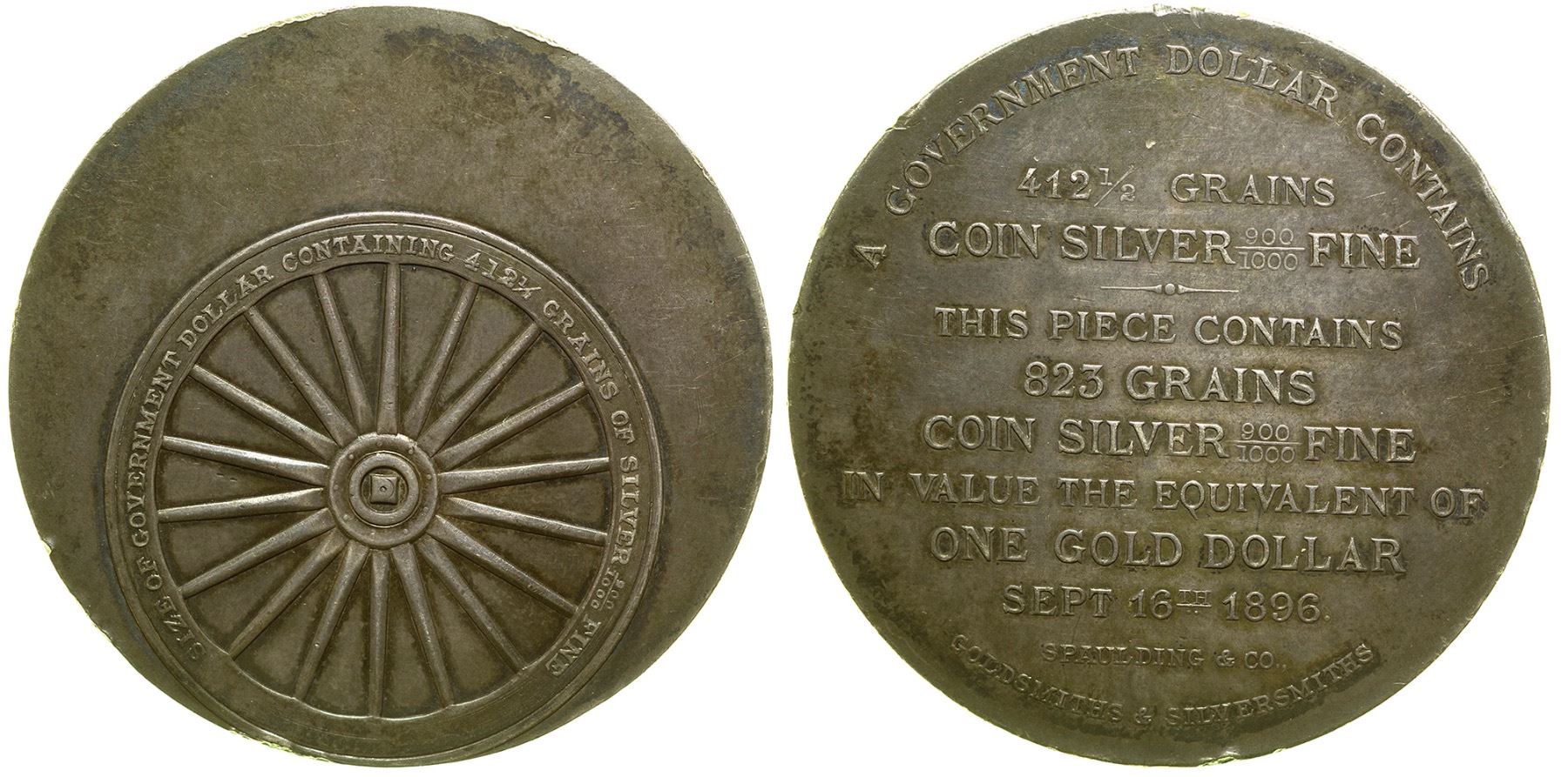 HK785, Schornstein 16. Obv.: In nine lines, first and last curved, others straight, "A Government Dollar Contains / 412 1/2 Grains / Coin Silver 900/1000 Fine / This Piece Contains / 823 Grains Coin Silver / In Value the Equivalent of / One Gold Dollar / Sept. 16th 1896 / Spaulding and Co. / Goldsmiths and Silversmiths." Obv.: On rim of cartwheel which springs from bottom edge, "Size of Government Dollar Containing 412 1/2 Grains of Silver 900/1000 Fine." Silver, 52mm, R-5. Spaulding and Co. had offices in Chicago and Paris, France. City: State: Date: HWAC# 51861