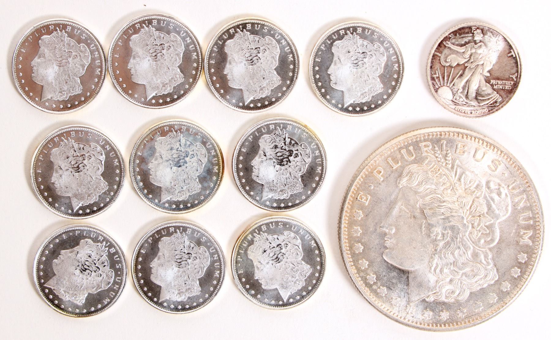 Morgan dollar facsimiles, made of .999 silver: one ounce piece & eleven 1/10 ounce (18 mm) pieces. [