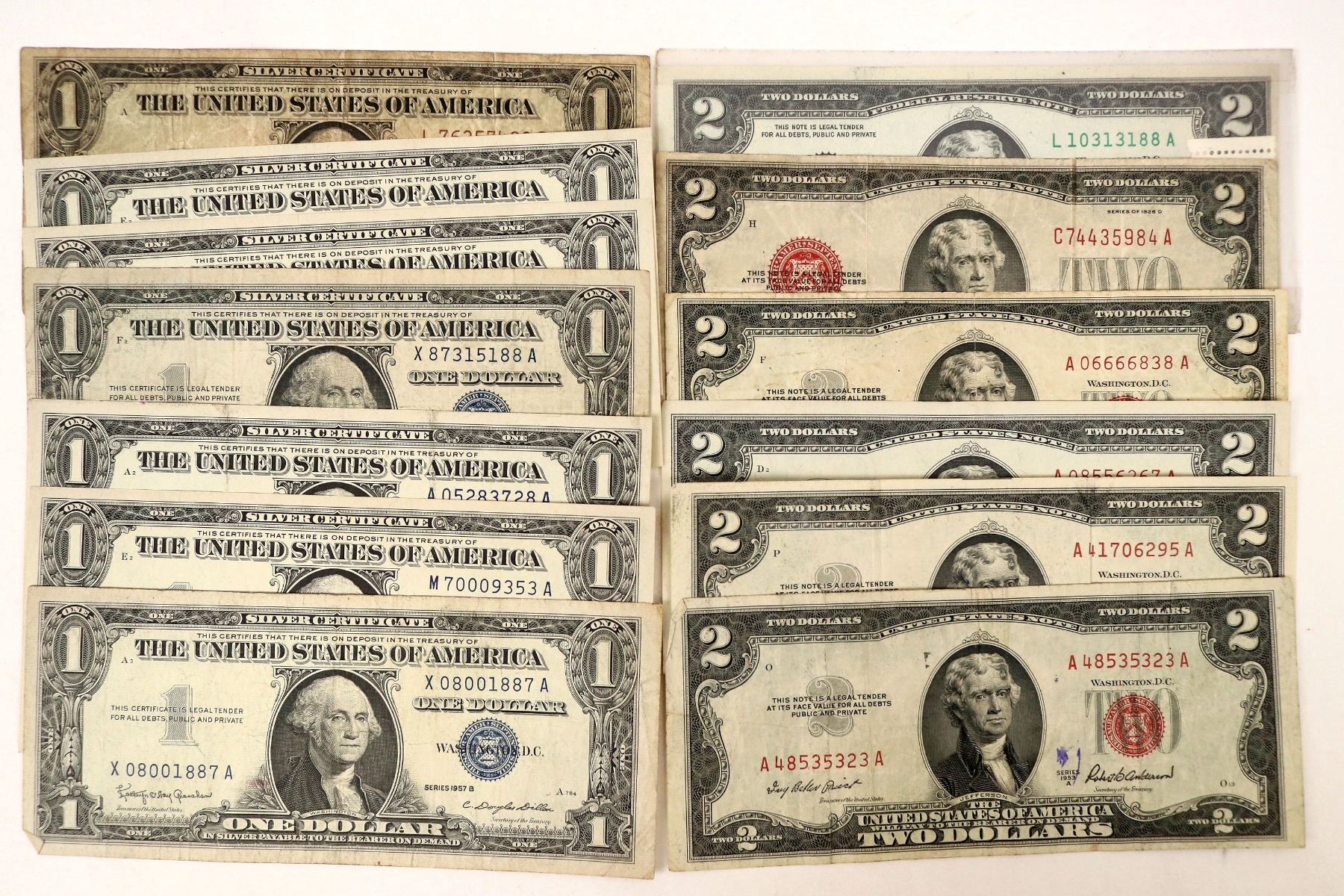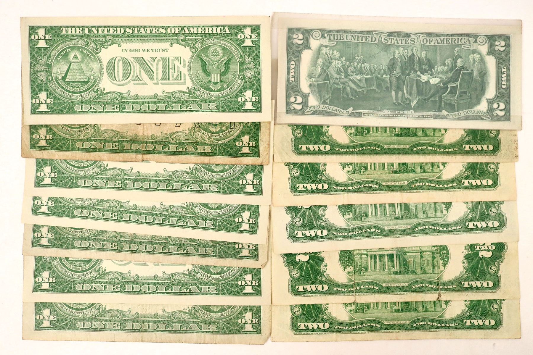 Seven $1 silver certificates series 1935 (1) and 1957 (6); six $2 bills: United States Notes (5) and one Federal Reserve Note series 1976 with Bicentennial postmark.