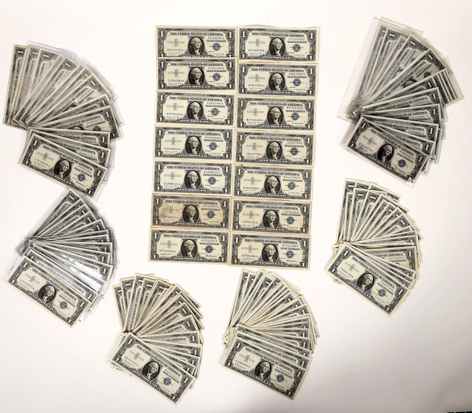 Lot of 162 $1 silver certificates. Series of 1957 and later. Many crisp uncirculated, sequential numbers. About 50 are uncirculated.