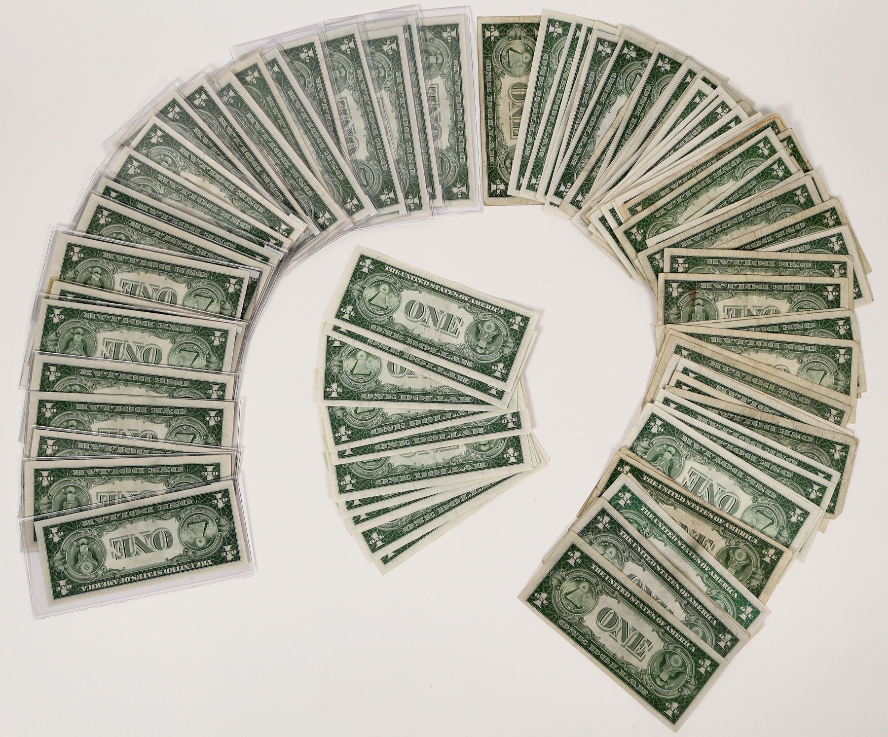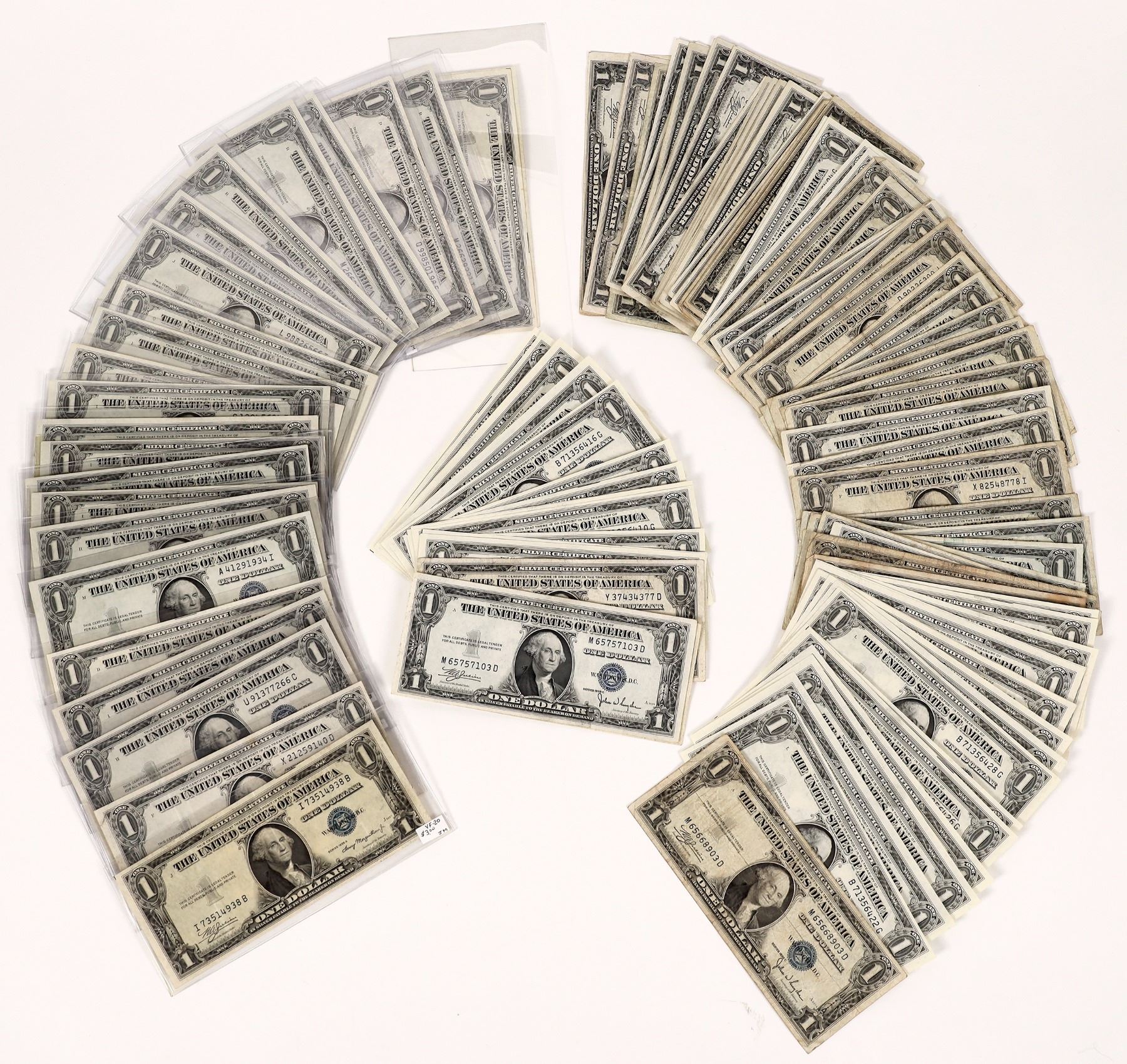 Lot of 116 $1 silver certificates from the Series of 1935. 1935 (1); 1935A (25, many CU); 1935C (8); 1935D (45: 25 sequenced CU); 1935E (25, many CU, sequenced); 1935F (4); 1935G (6); 1935 H (2). 1935